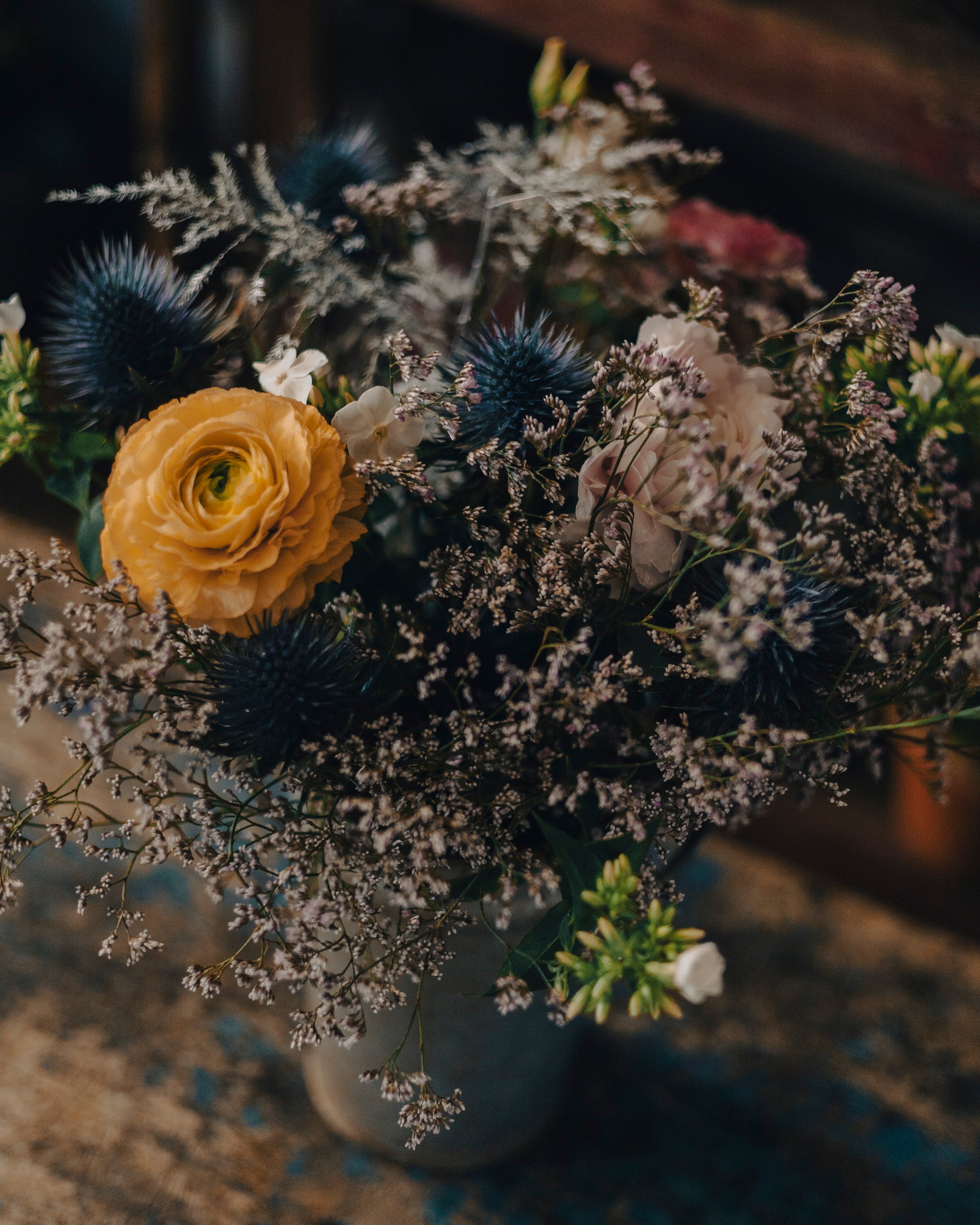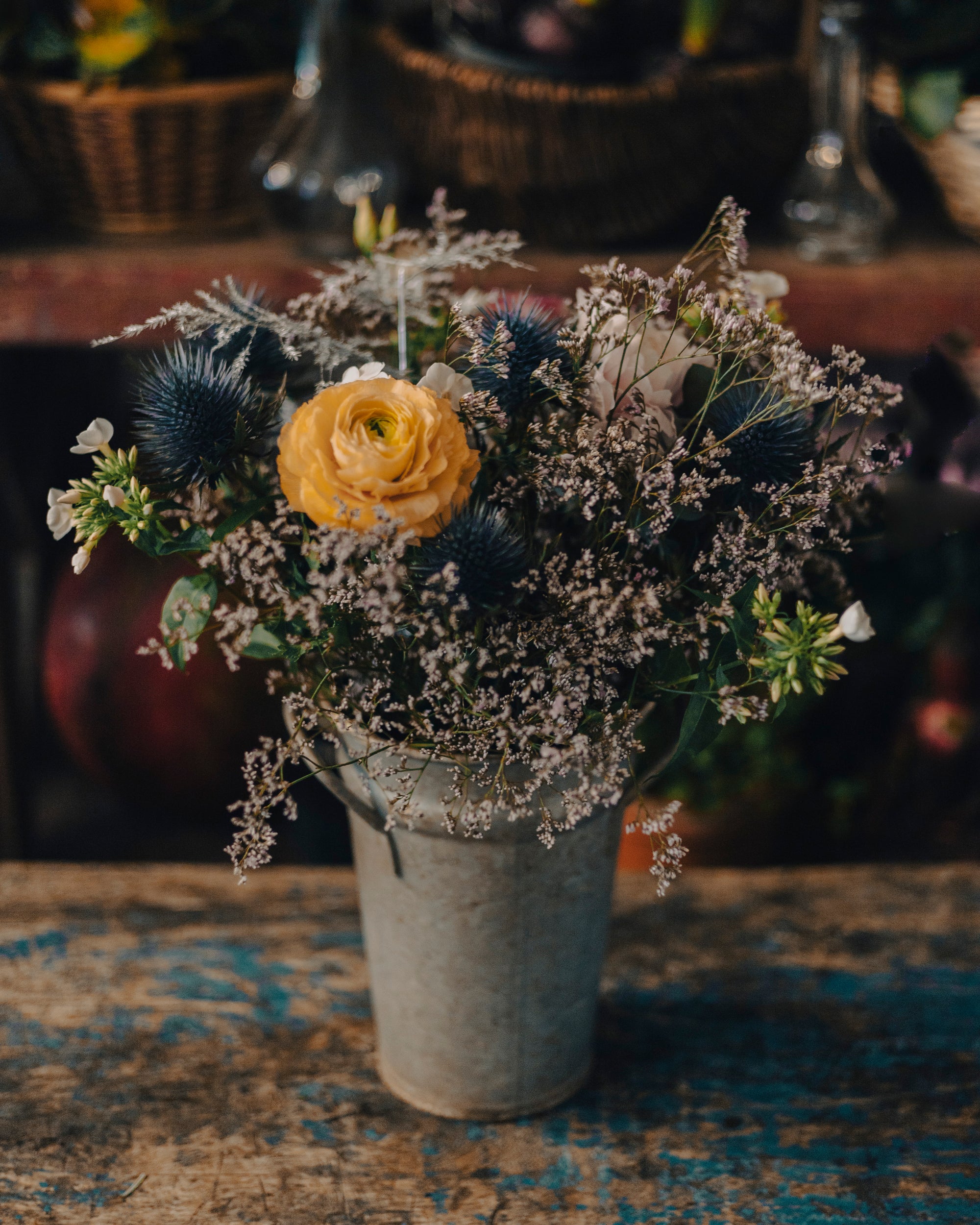 - Bleu : Représente la noblesse, la fierté et la tranquillité. Les chardons bleus ajoutent une note de dignité et de calme, équilibrant parfaitement les couleurs vives des renoncules.