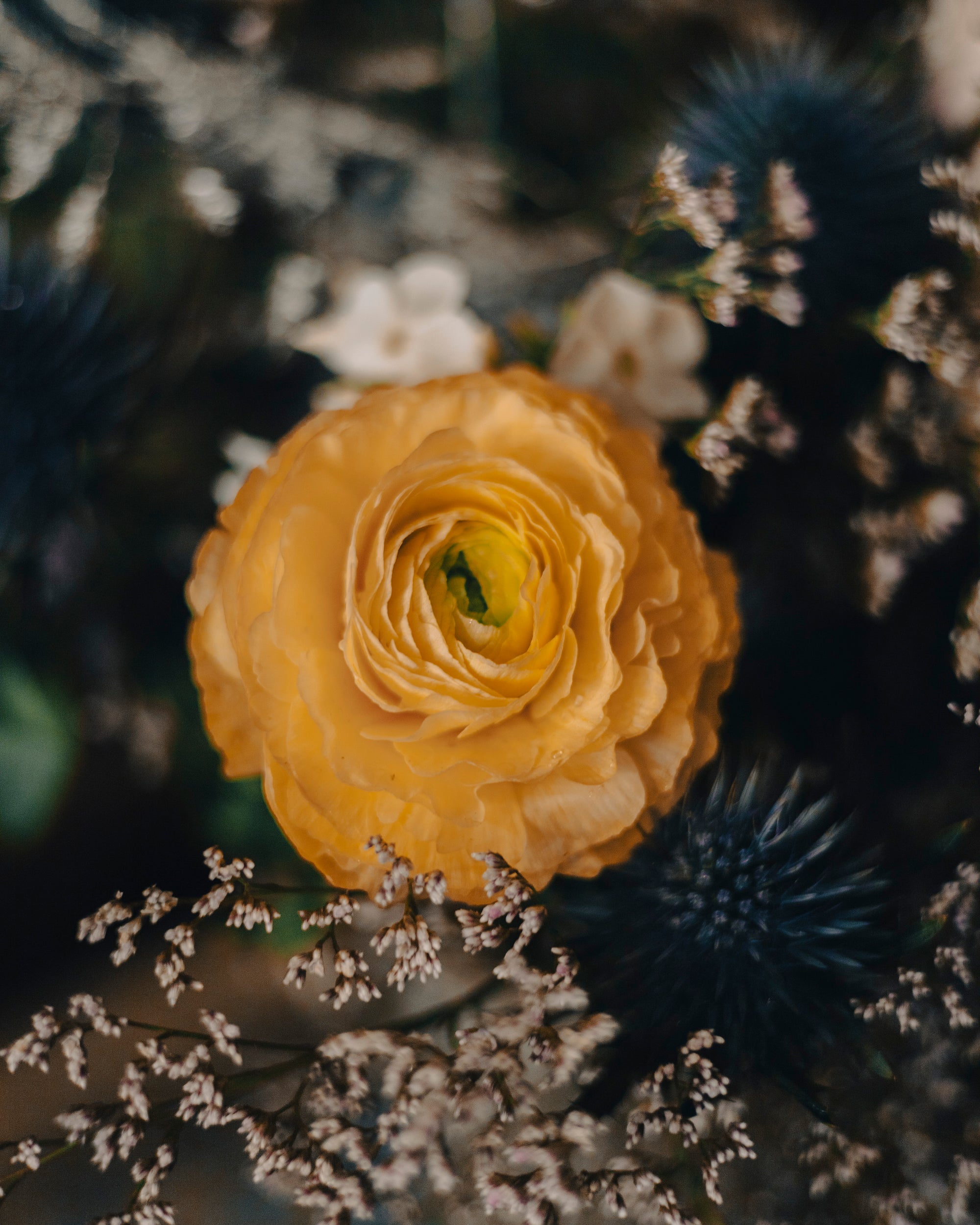 Depuis l'antiquité, les fleurs sont des symboles de communication émotionnelle. Elles embellissent les moments les plus précieux et représentent la pureté et la beauté dans les cultures du monde entier. Ce bouquet, avec ses renoncules jaunes, chardons bleus, gypsophiles et feuillage vert, capture parfaitement cette tradition intemporelle de beauté et d'expression des émotions.