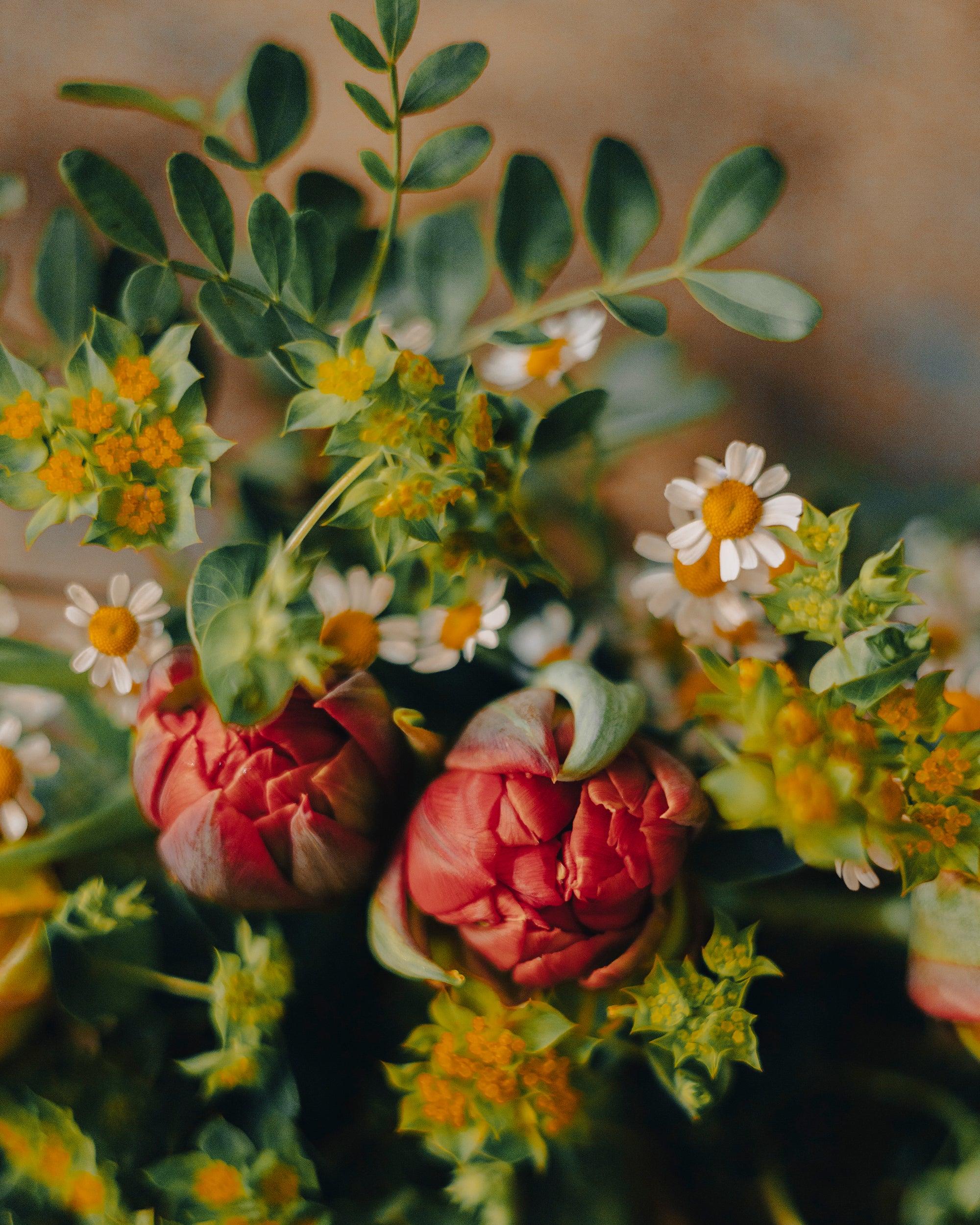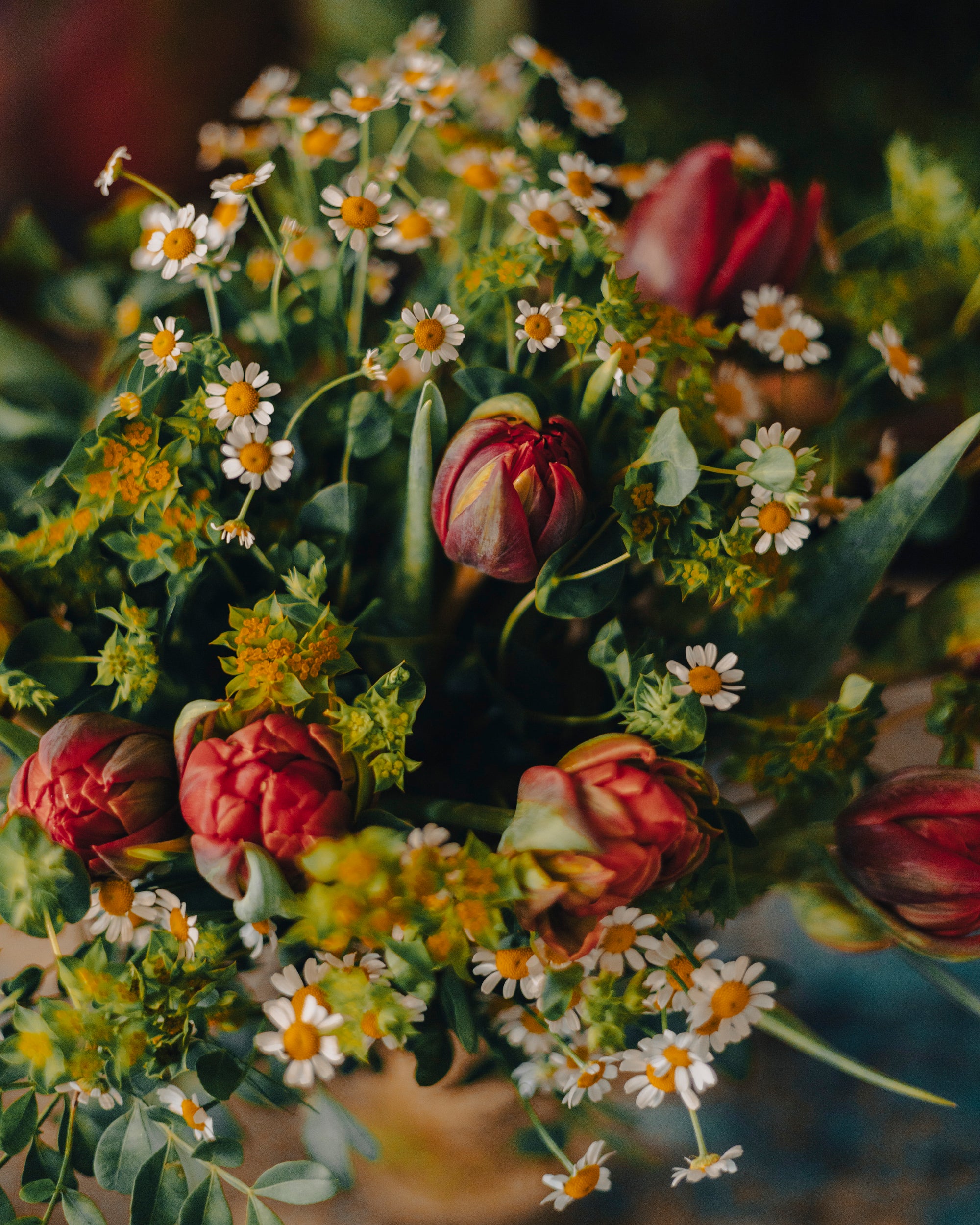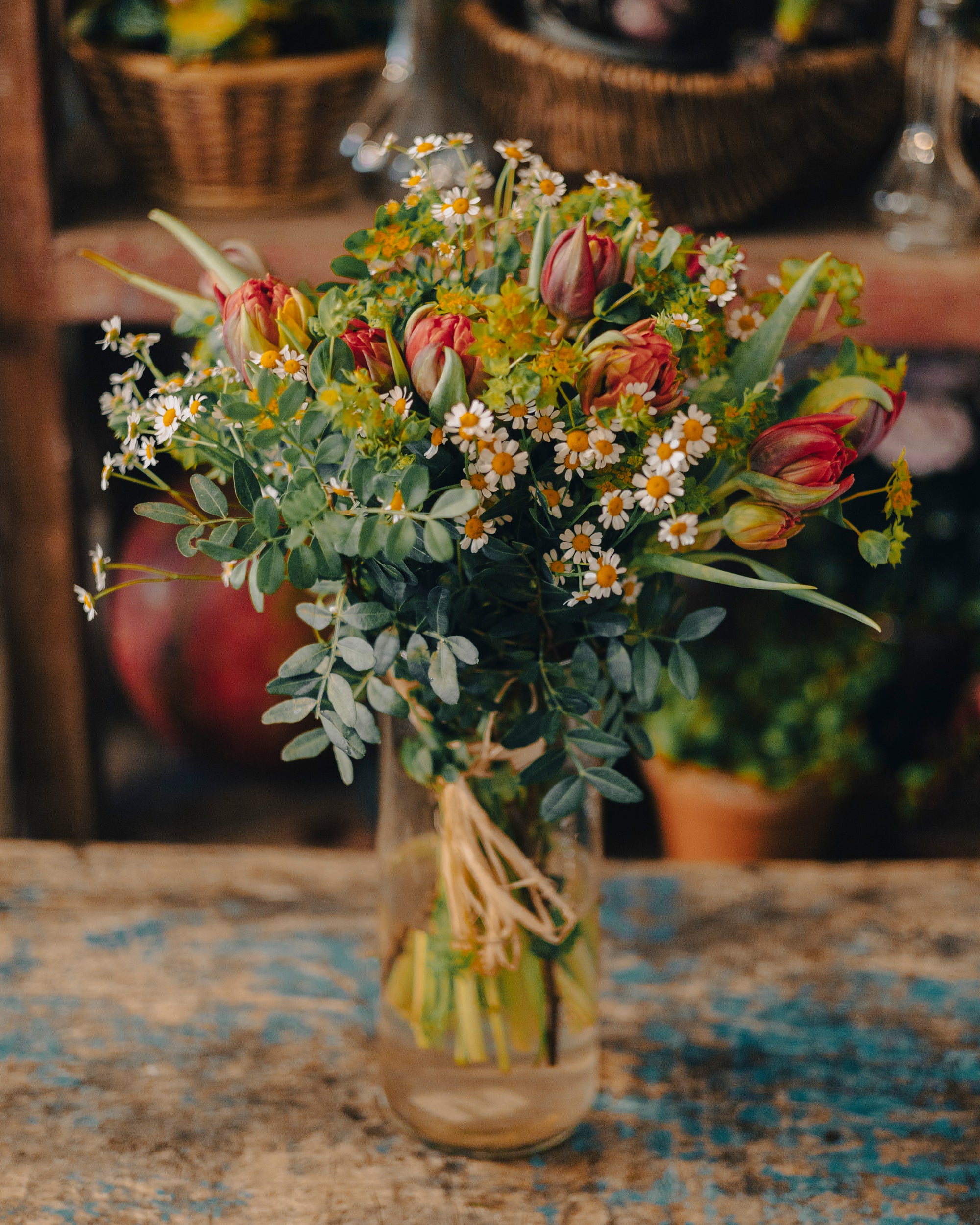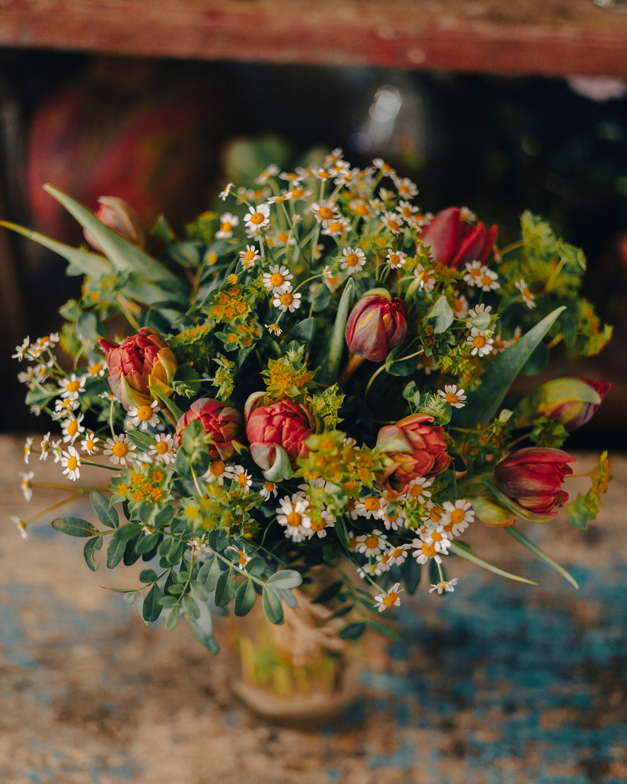 Notre Bouquet Jardin Enchanté est une composition qui évoque la douceur d'un jardin anglais. Il combine des tulipes rouges prêtes à éclore, symboles d'amour parfait, avec l'innocence des marguerites blanches et l'éclat solaire des fleurs d'achillée. Ces éléments sont harmonieusement intégrés avec le feuillage vert luxuriant, créant un équilibre parfait entre couleur et forme.