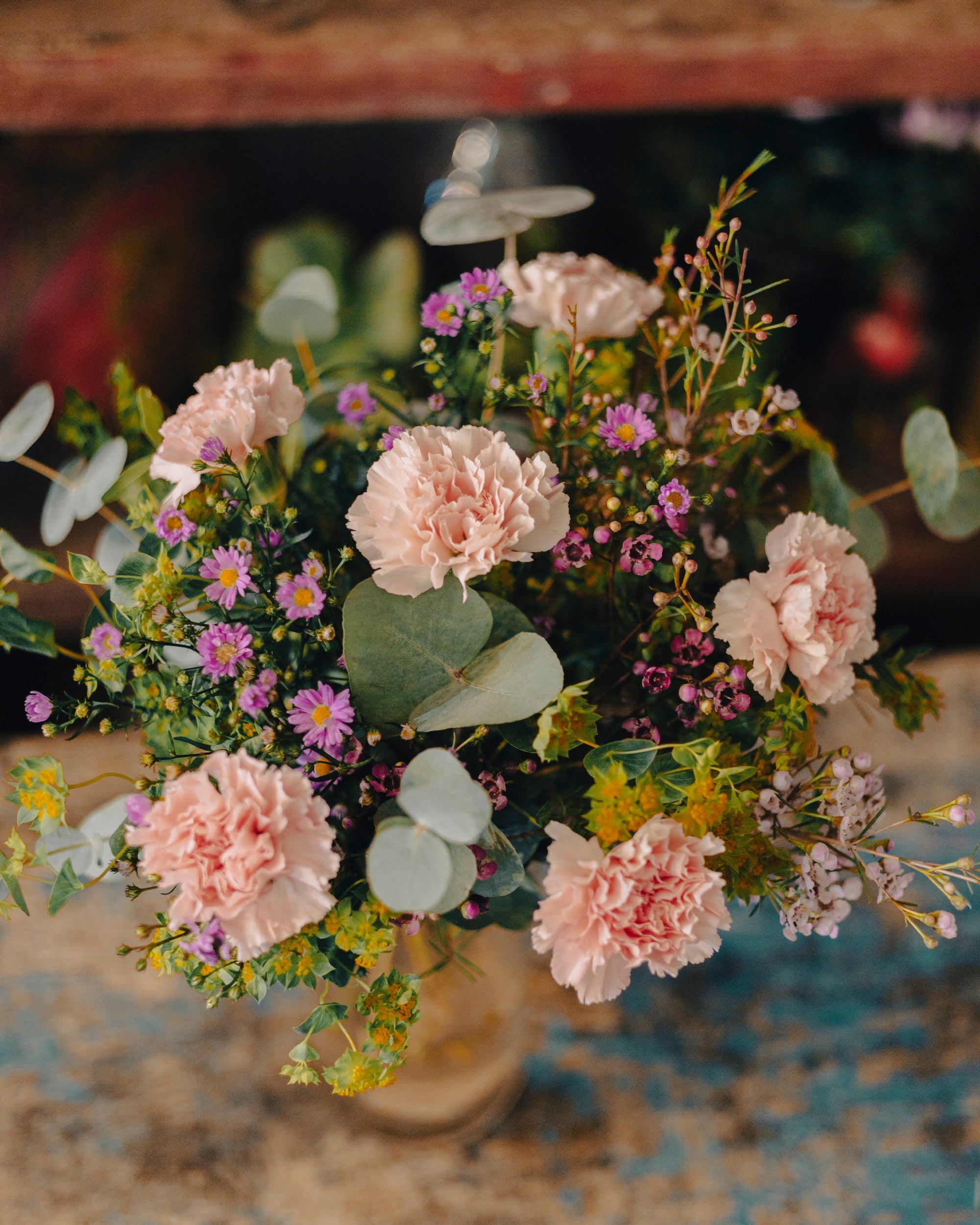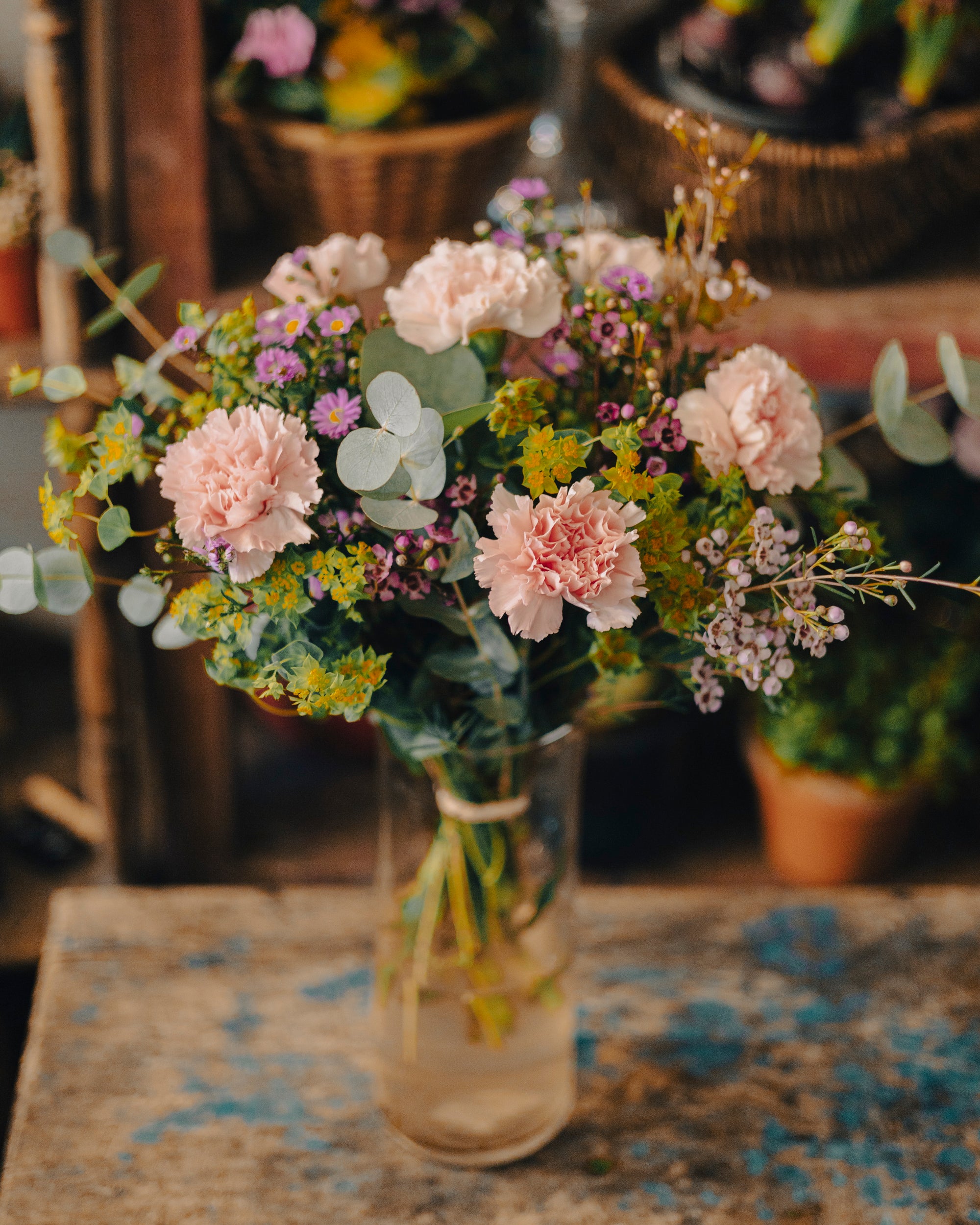 Notre Bouquet Charme Pastel est une célébration douce et apaisante, qui marie les carnations rose pâle avec des nuances délicates de violet et de vert. Ce bouquet évoque un sentiment de calme et de tendresse, chaque fleur étant soigneusement choisie pour sa forme et sa nuance subtile, et présentée dans un vase en verre pour un effet aéré et lumineux.