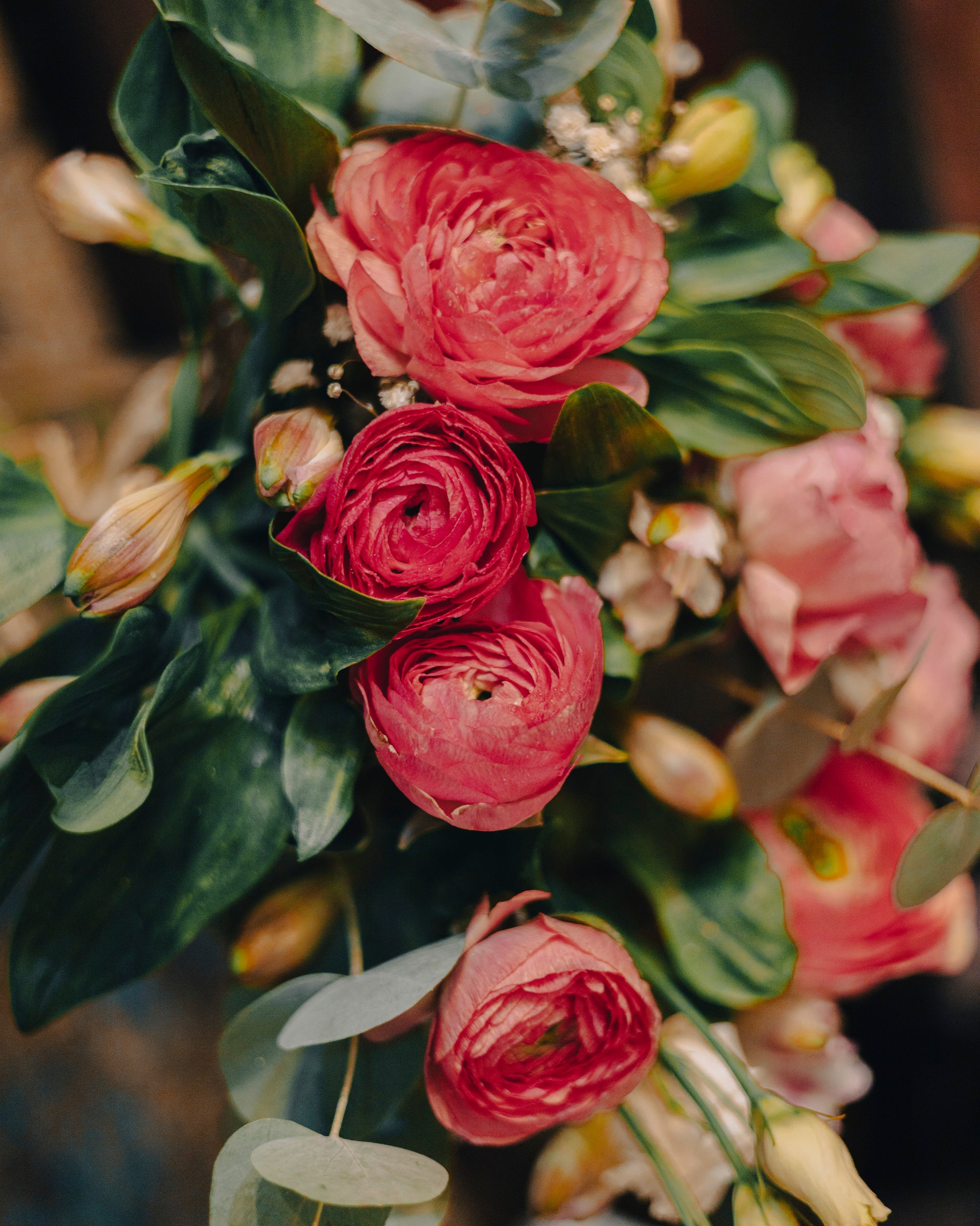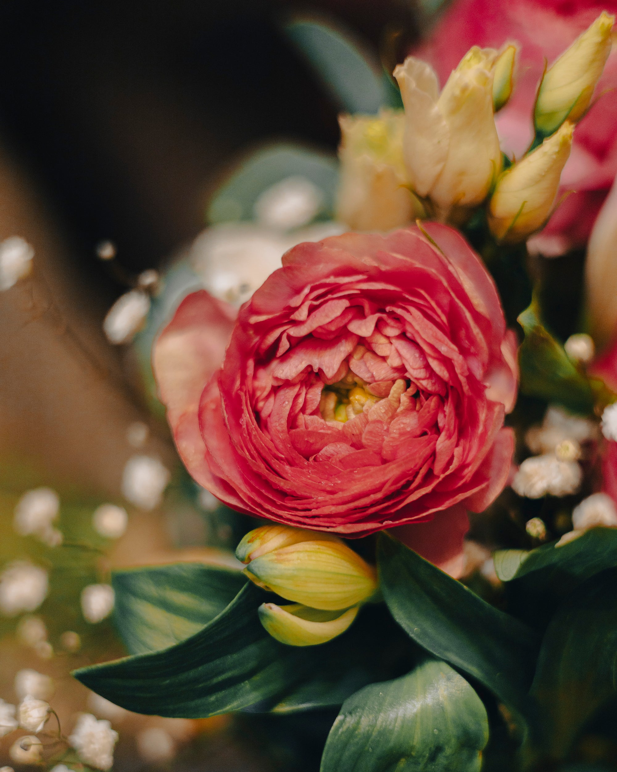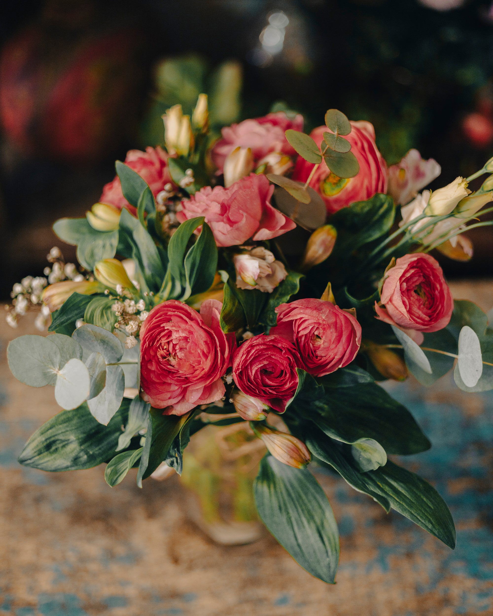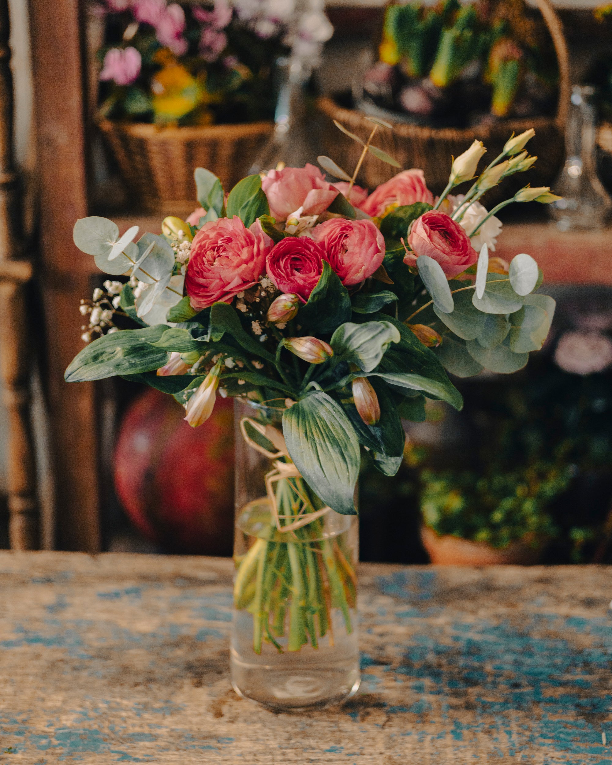 Le Bouquet Éclat Rosé est une célébration de féminité et de beauté naturelle. Il présente une sélection de ranunculus roses et d'alstroemerias, s'épanouissant parmi un éventail de feuillage vert argenté et de petites fleurs délicates, apportant texture et profondeur à l'ensemble. Le vase en verre simple mais élégant offre une vue claire sur les tiges gracieuses, soulignant la fraîcheur et l'authenticité des fleurs.