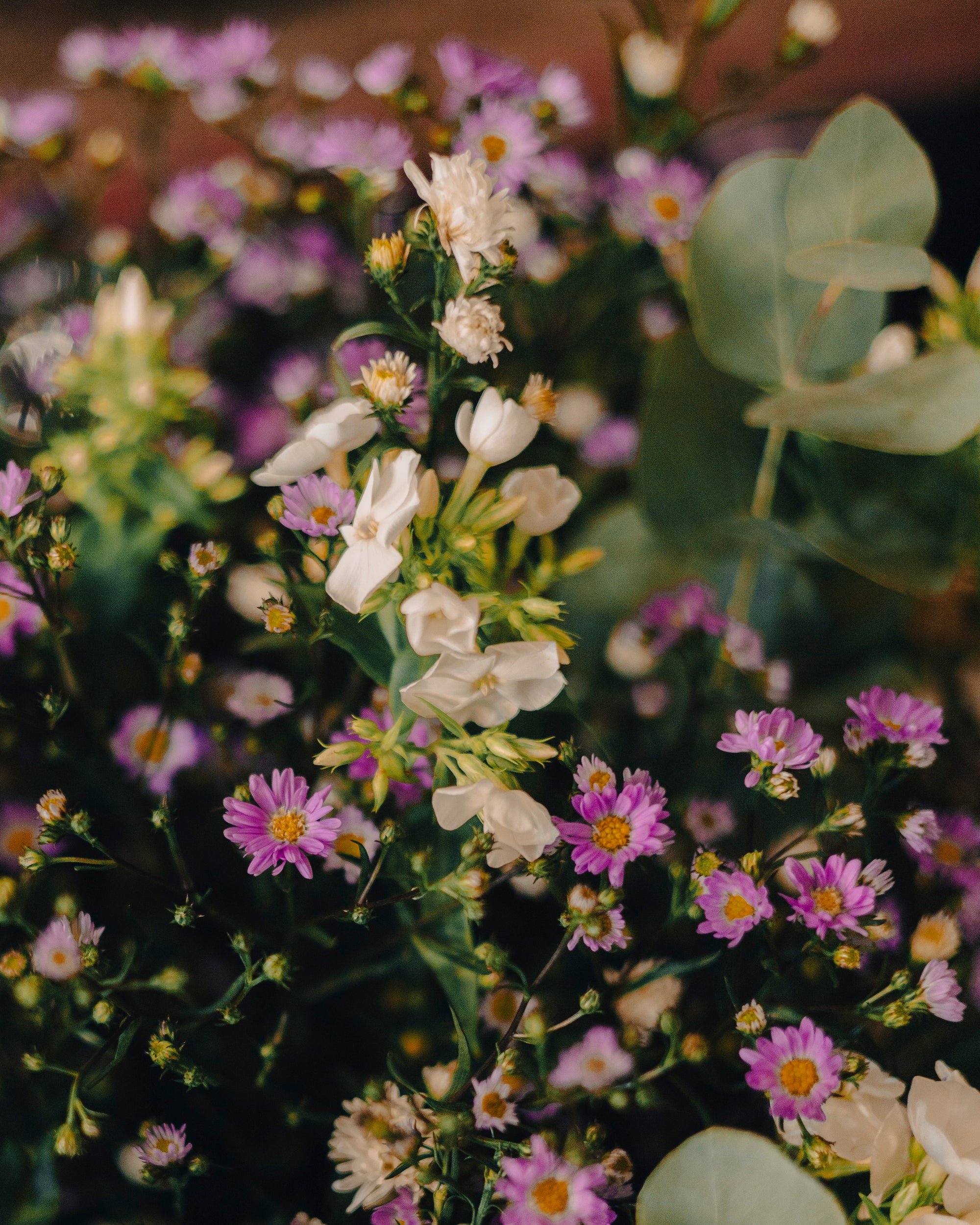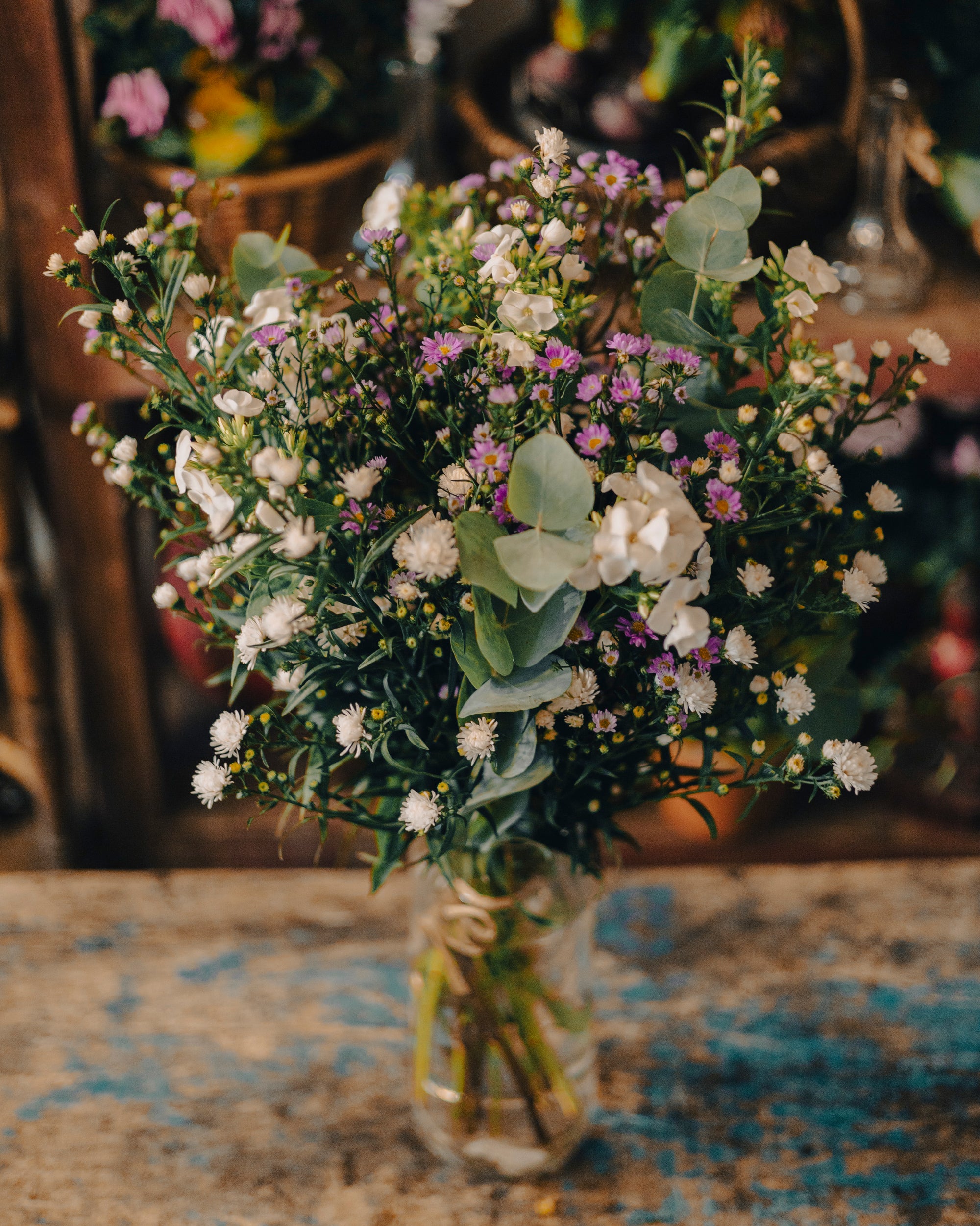 Le Bouquet Fraîcheur Champêtre est une composition qui respire la liberté et l'air pur des champs fleuris. Avec ses fleurs blanches délicates et ses touches de violet, ce bouquet est un hymne à la douceur des jours ensoleillés. Le feuillage d'eucalyptus ajoute une note de fraîcheur et de calme, et le tout est présenté dans un vase en verre transparent qui met en valeur la structure naturelle et l'élégance des tiges.