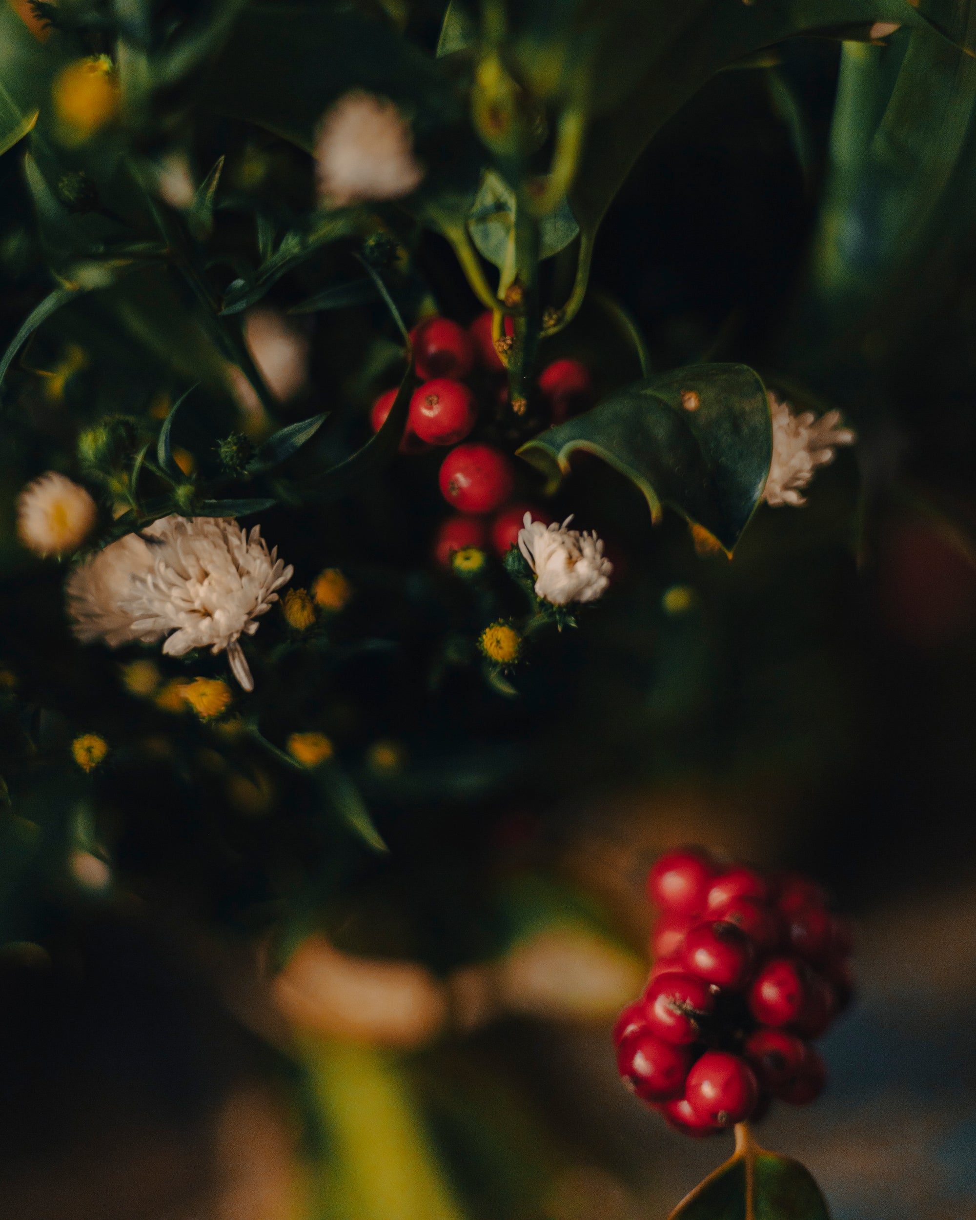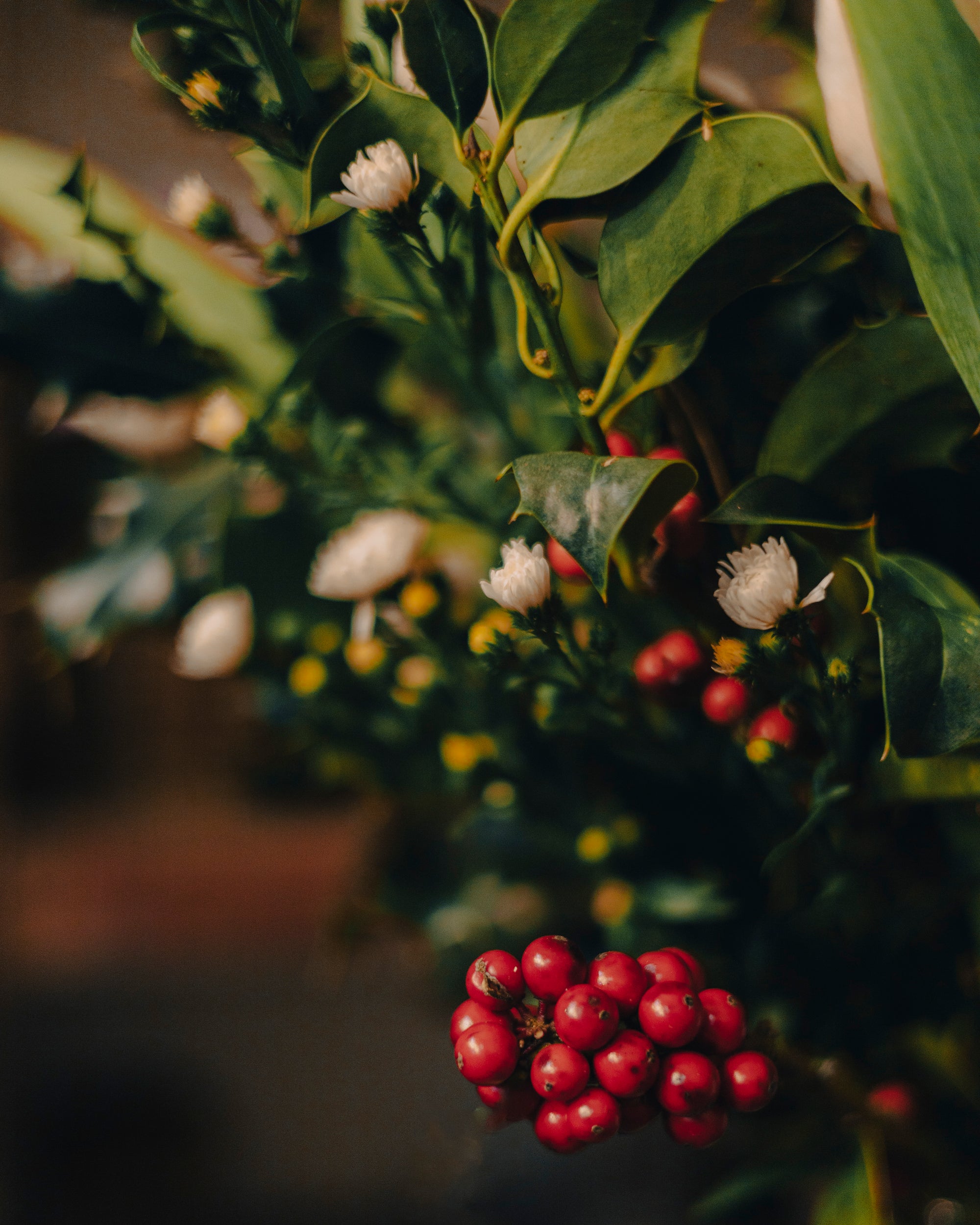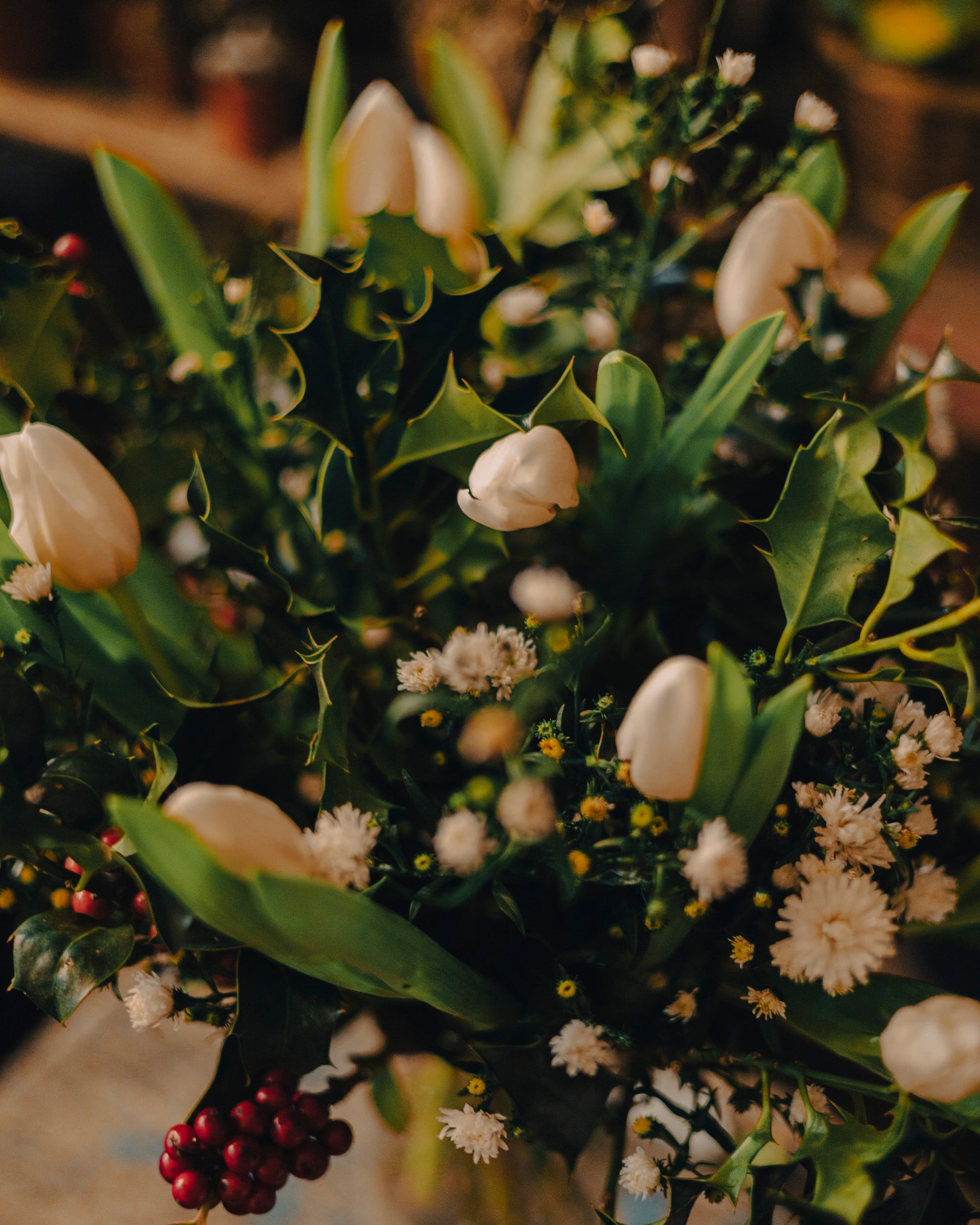 Le houx avec ses baies rouges est la fleur la plus représentative de ce bouquet. Le houx est une plante emblématique, particulièrement en période de Noël, où il est utilisé pour décorer les maisons et les églises. Une légende ancienne raconte que le houx était autrefois un arbre sans épines. Lorsque Jésus fut crucifié, on dit que la couronne d'épines fut fabriquée à partir du houx, et les feuilles se couvrirent d'épines en signe de douleur, tandis que les baies rouges représentaient les gouttes de sang du Christ. Depuis lors, le houx est devenu un symbole de protection et de prospérité.