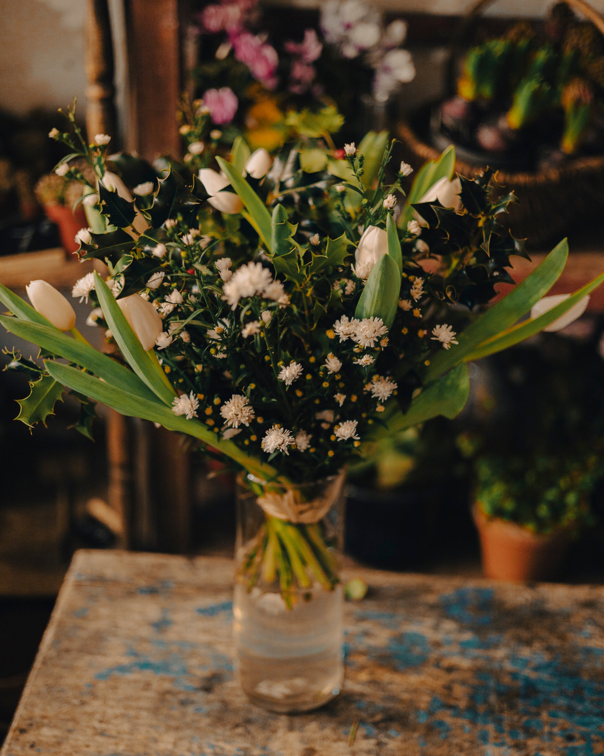 Les fleurs de ce bouquet proviennent de diverses régions du monde, chaque variété apportant sa propre histoire et symbolisme. Les tulipes, houx, petites fleurs blanches et feuillage vert sont cultivés avec soin pour garantir leur fraîcheur et leur éclat.