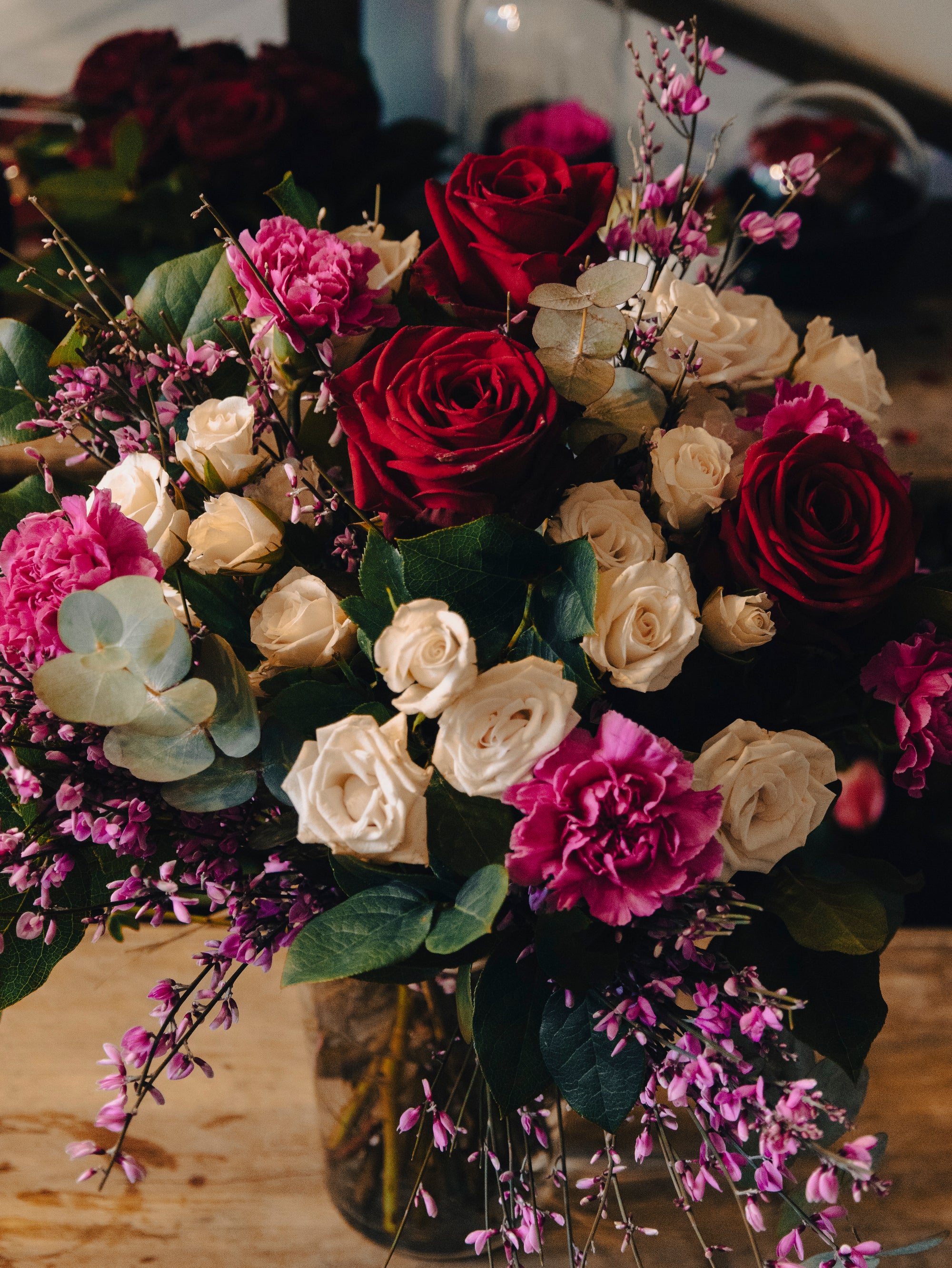 Le Bouquet "Panache des Bois Enchantés" est une célébration audacieuse de la diversité et de la splendeur. Les roses rouges majestueuses, symboles d'un amour fougueux et d'une estime inébranlable, se tiennent fièrement aux côtés des roses crème, représentant la grâce et l'élégance. Les carnations fuchsia ajoutent une touche de fantaisie et de vivacité, tandis que les délicats accents de fleurs de genêt peignent des touches de légèreté et de joie. Le feuillage vert et les eucalyptus apportent une texture riche et une sensation de calme et de sérénité. Présenté dans un vase transparent, ce bouquet est un hommage à l'abondance et au caractère sauvage des forêts enchantées.