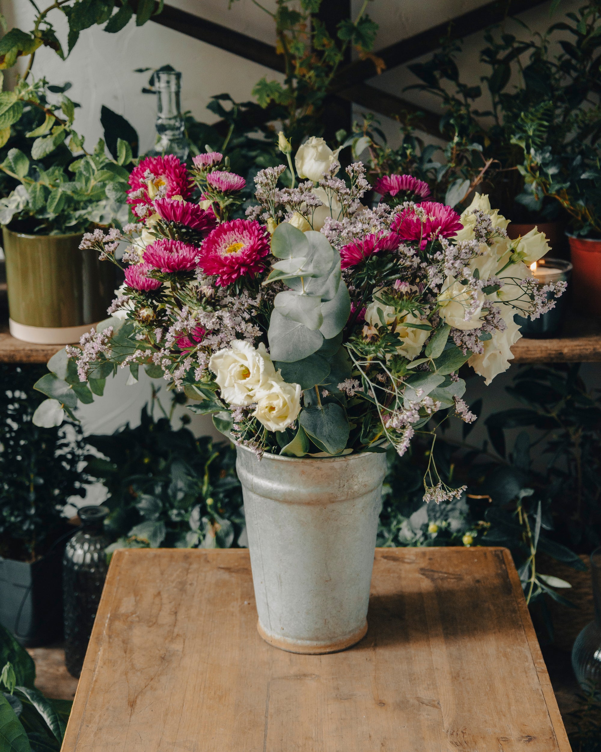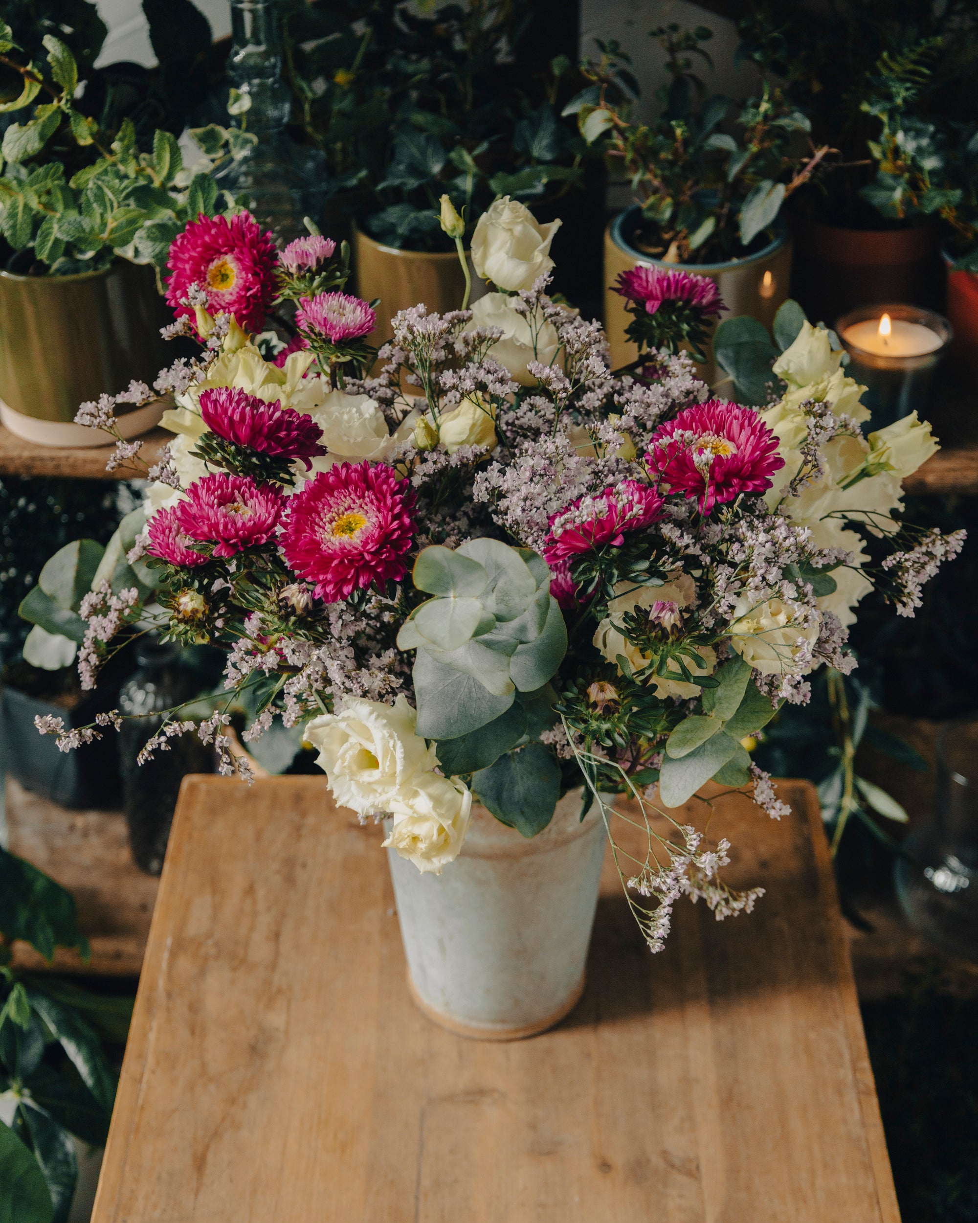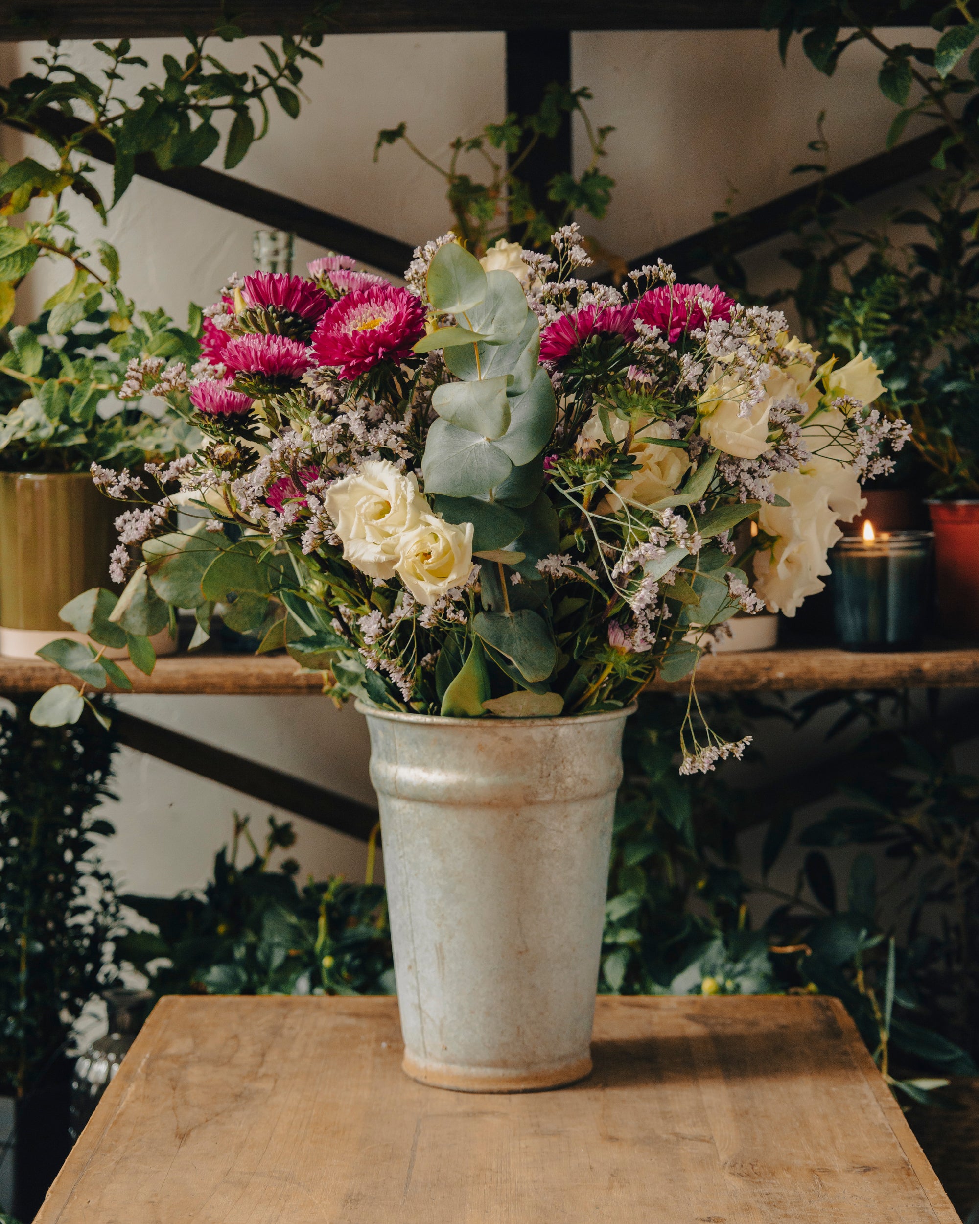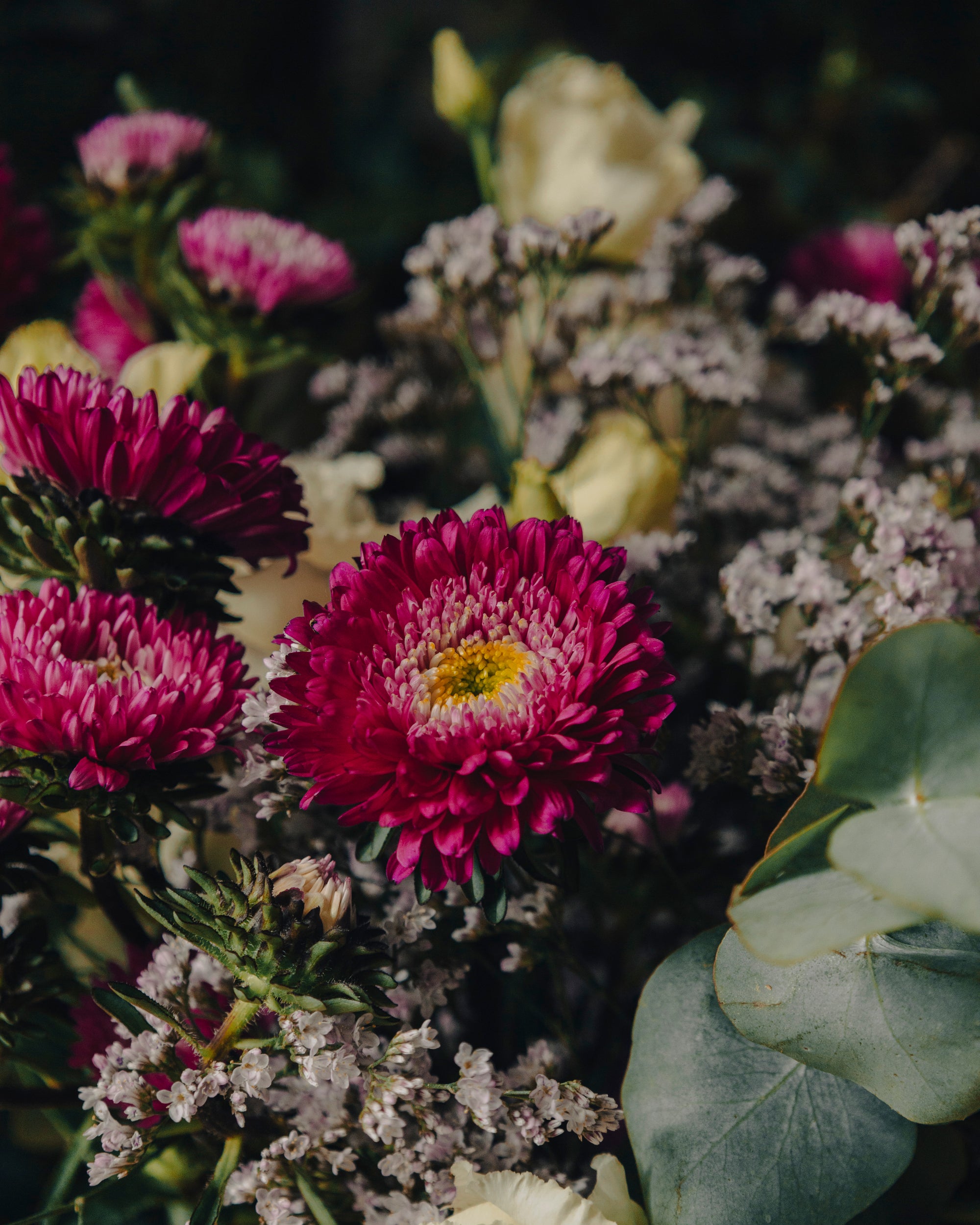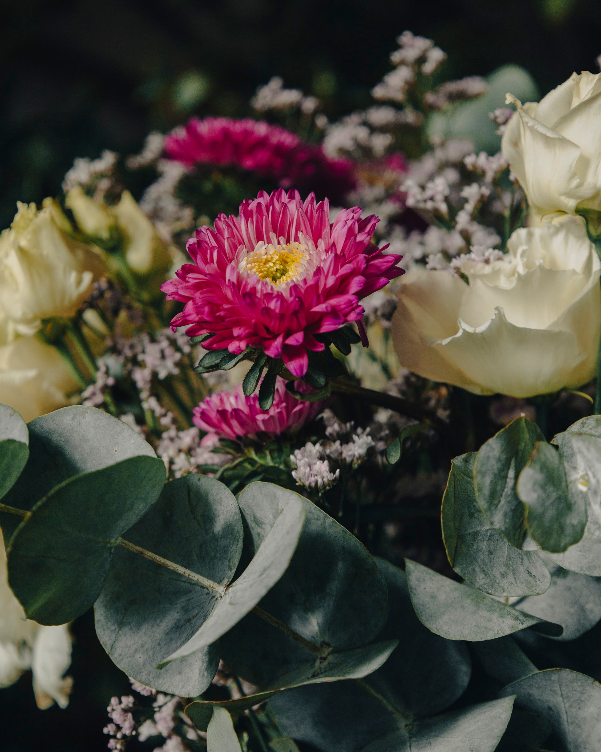 Depuis l'antiquité, les fleurs sont des symboles de communication émotionnelle. Elles embellissent les moments les plus précieux et représentent la pureté et la beauté dans les cultures du monde entier. Ce bouquet, avec ses asters roses, roses crème et feuillage d'eucalyptus, capture parfaitement cette tradition intemporelle de beauté et d'expression des émotions.