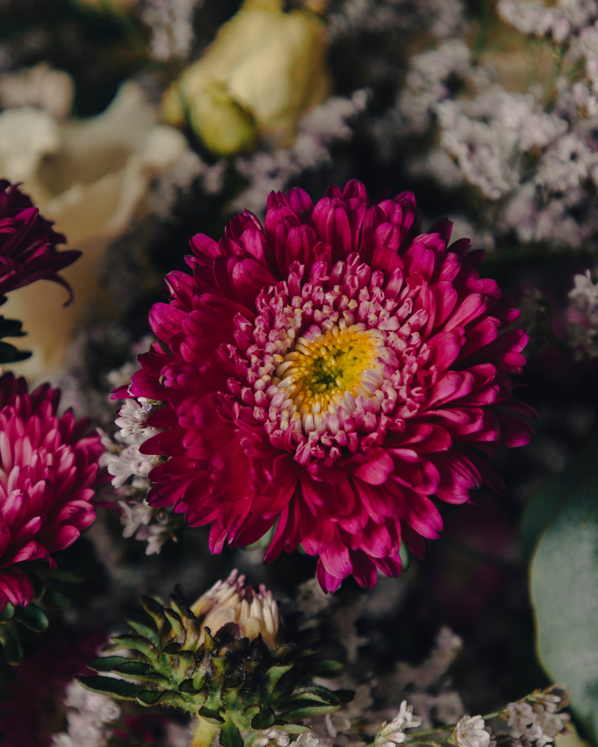 - Rose (Asters) : Symbolise l'amour, la patience et la délicatesse. Les asters roses de ce bouquet apportent une touche douce et romantique, représentant des sentiments de tendresse et d'affection.