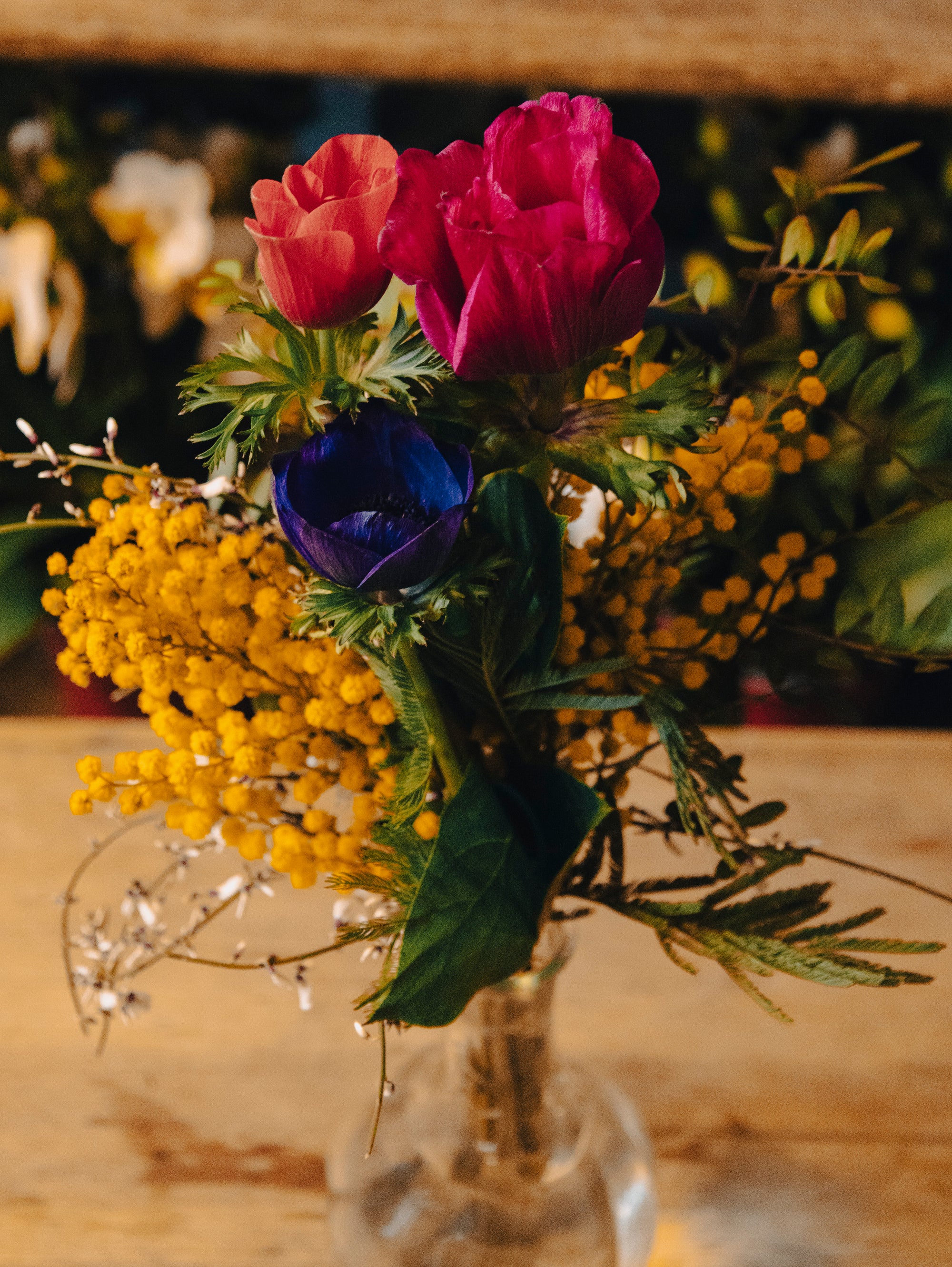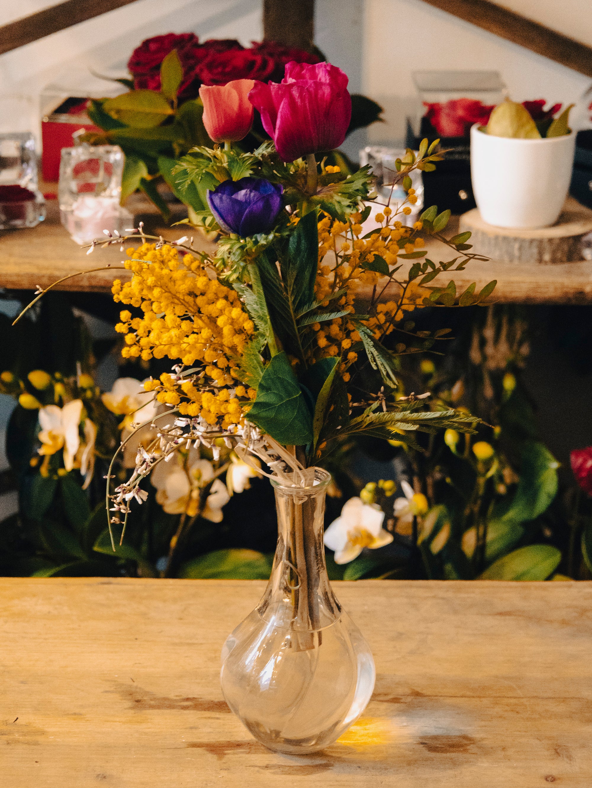 - Mimosa jaune : Ces petites sphères lumineuses apportent une note joyeuse et ensoleillée, équilibrant l’ensemble avec une touche légère et pétillante.