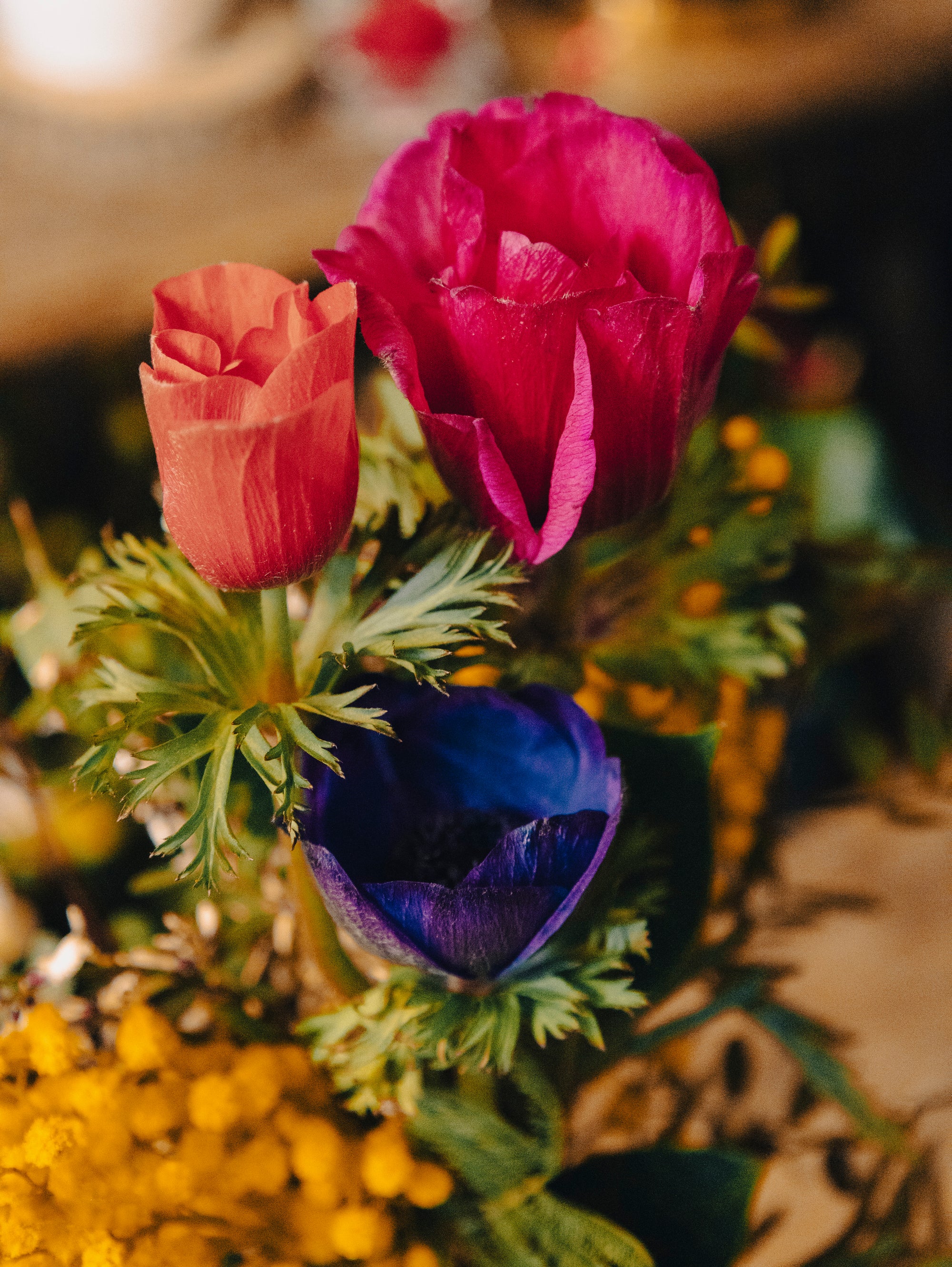 - Anémone violette : Avec son éclat de couleur vive, elle ajoute une profondeur et un contraste magnifique à la composition.