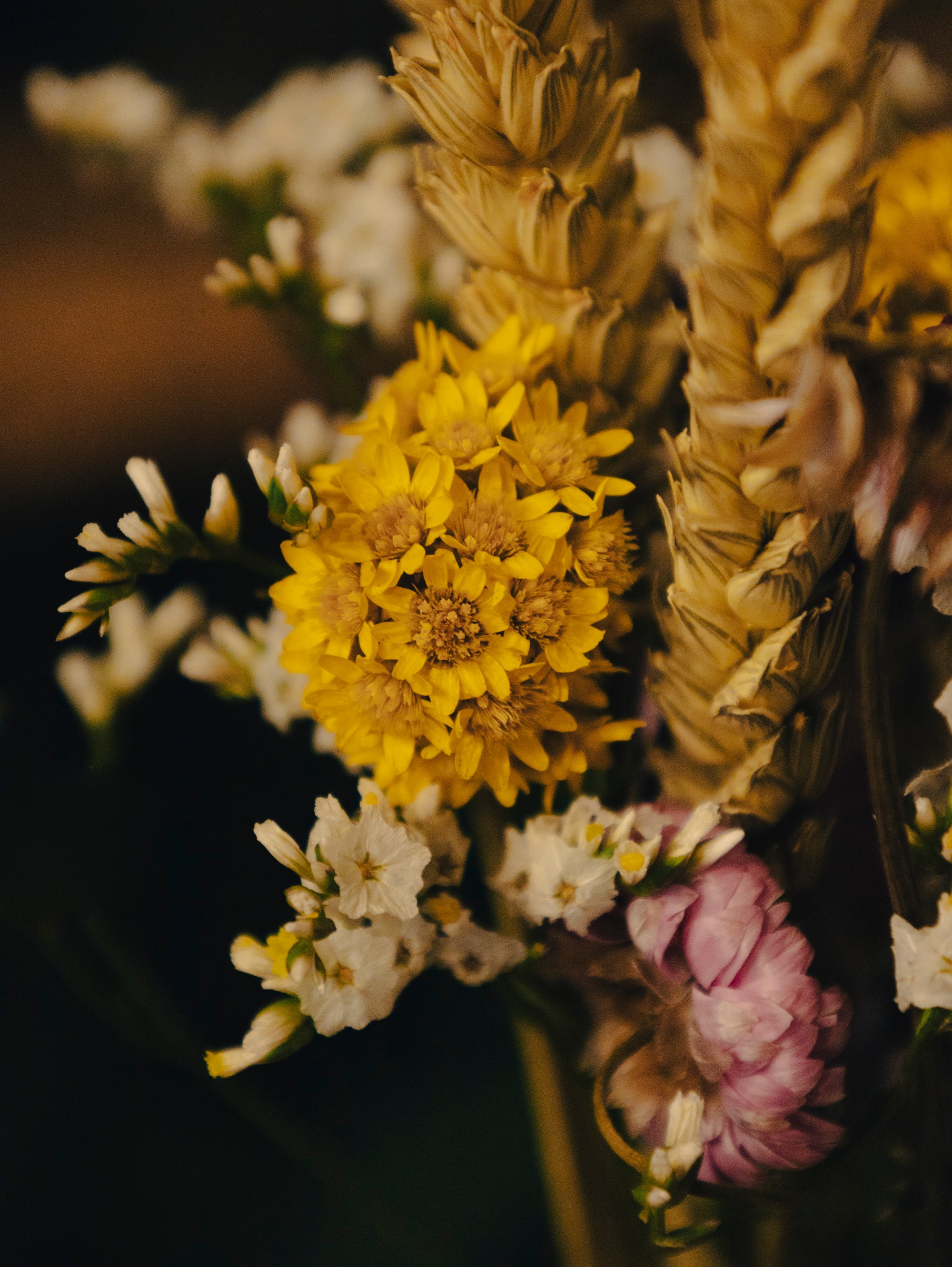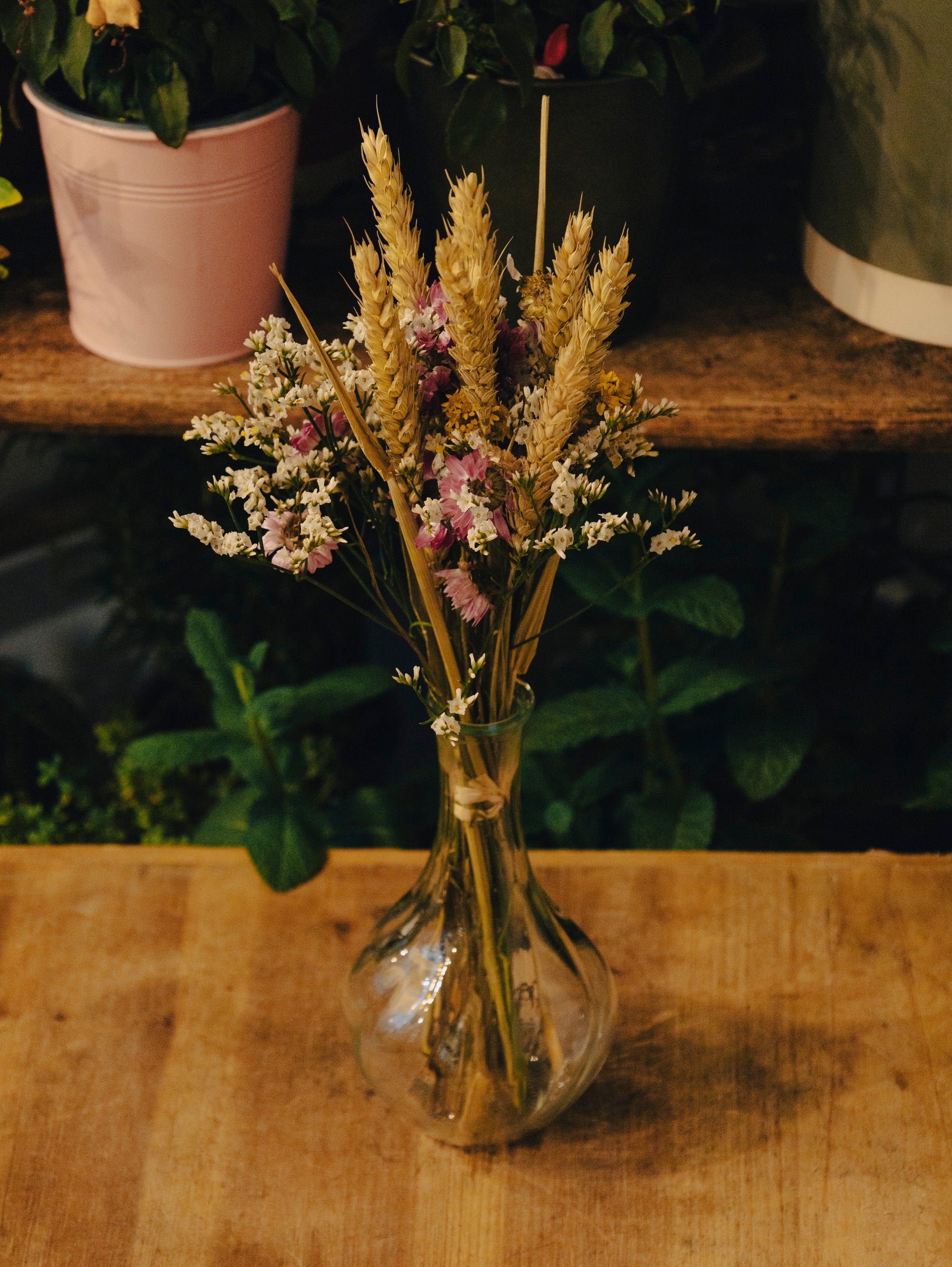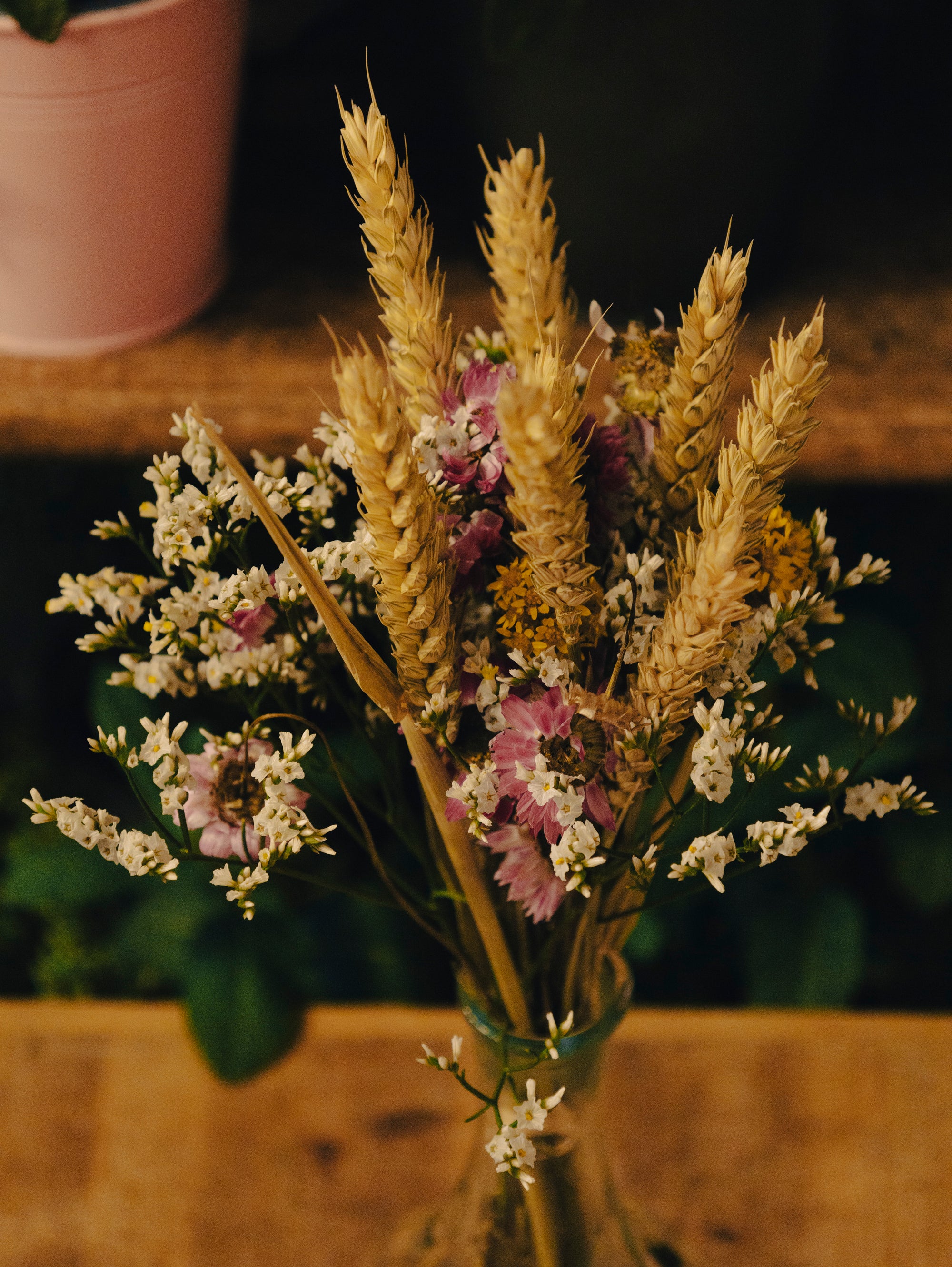 - Épis de blé séchés : Ils apportent hauteur et texture à la composition, rappelant les paysages agricoles et ajoutant un charme rustique.