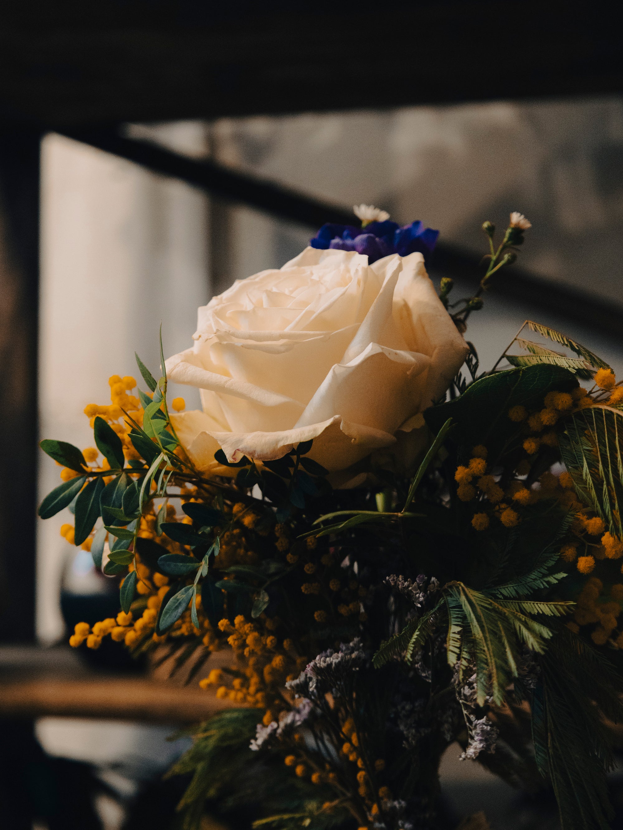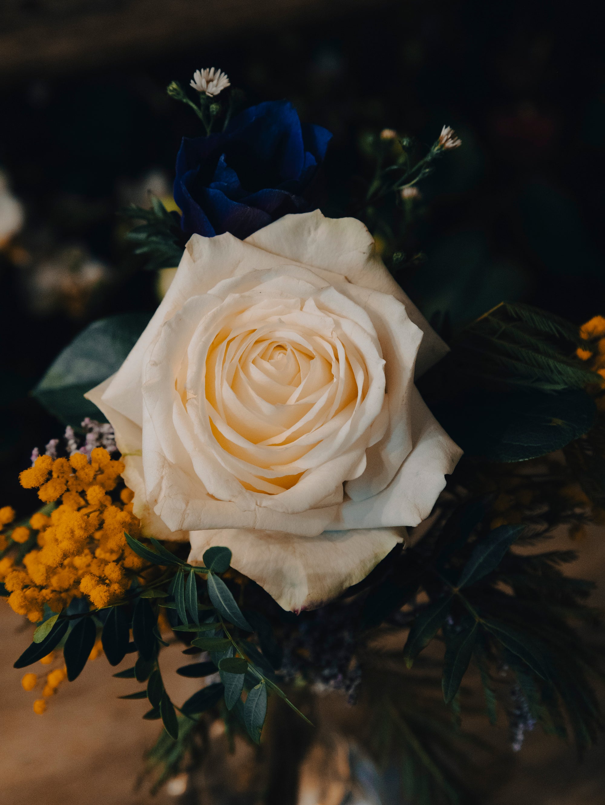 - Mimosa jaune : Avec ses petites boules dorées, le mimosa ajoute une note ensoleillée et joyeuse, contrastant magnifiquement avec la rose blanche.
