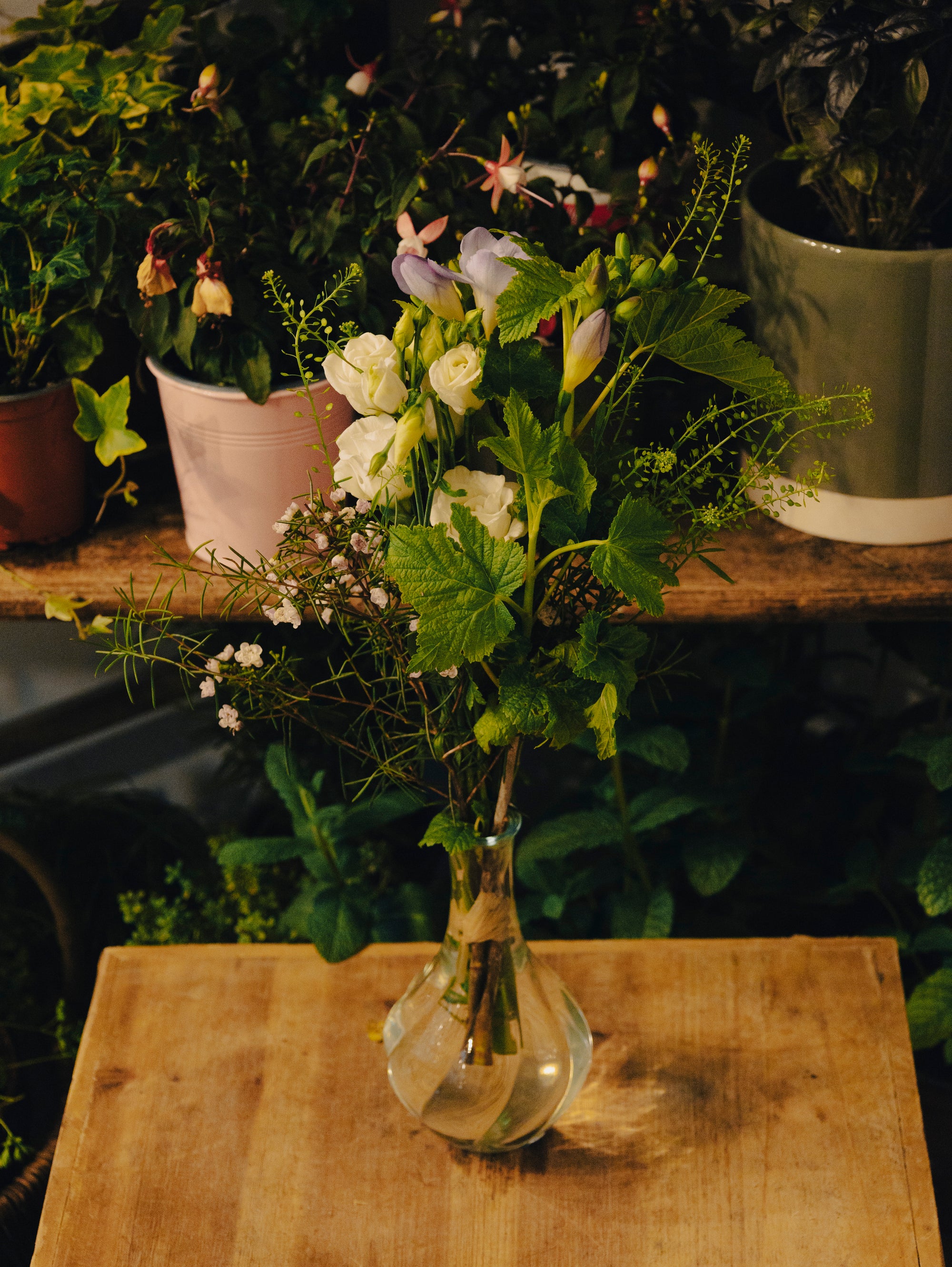 - Verdure variée : La verdure, avec ses grandes feuilles et ses tiges fines, encadre parfaitement les fleurs et apporte une touche de fraîcheur naturelle.