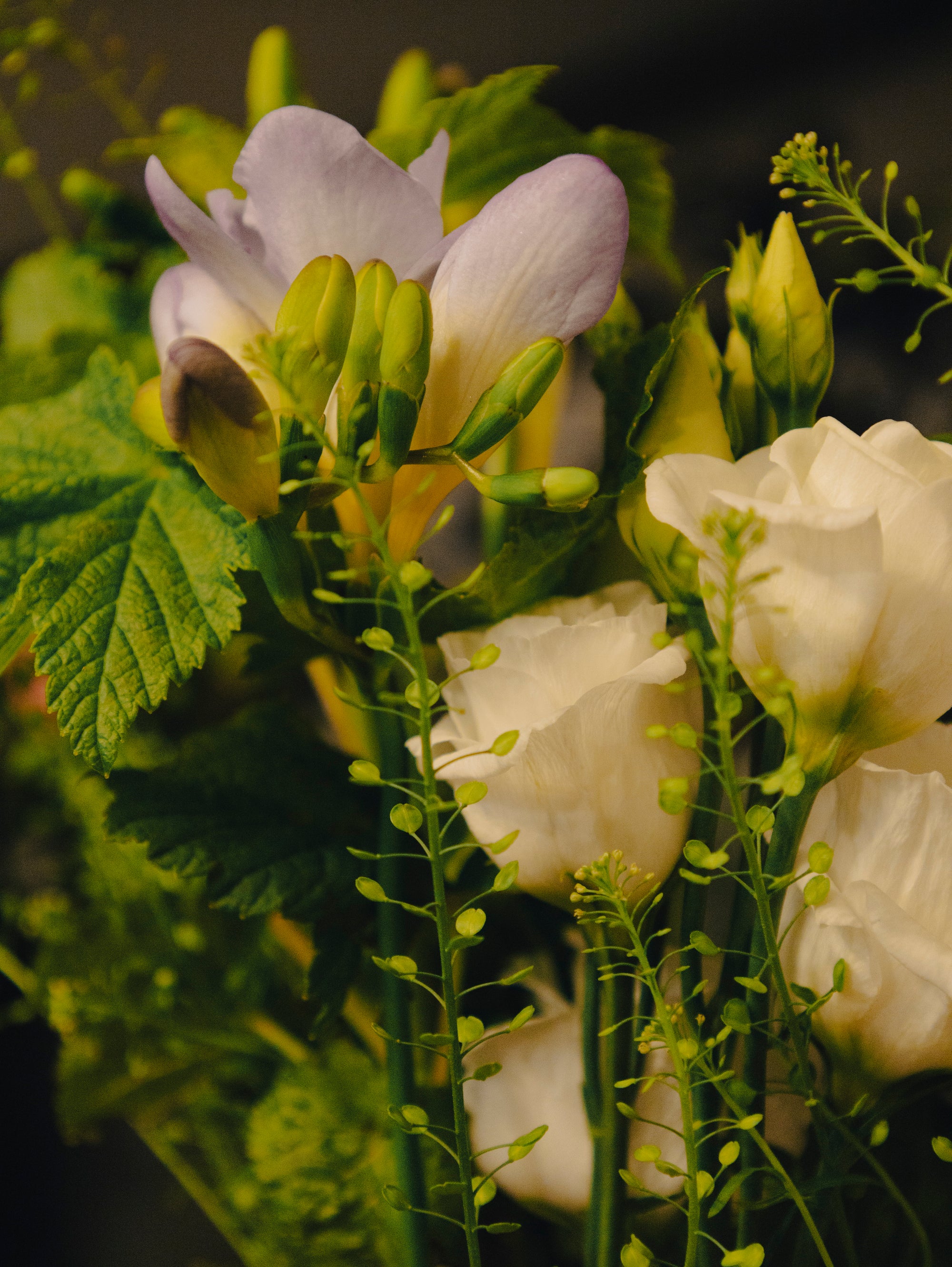 - Freesias blancs et violets : Ces fleurs délicates apportent une élégance subtile et parfumée à la composition, offrant un doux contraste de couleurs entre le blanc pur et le violet tendre.