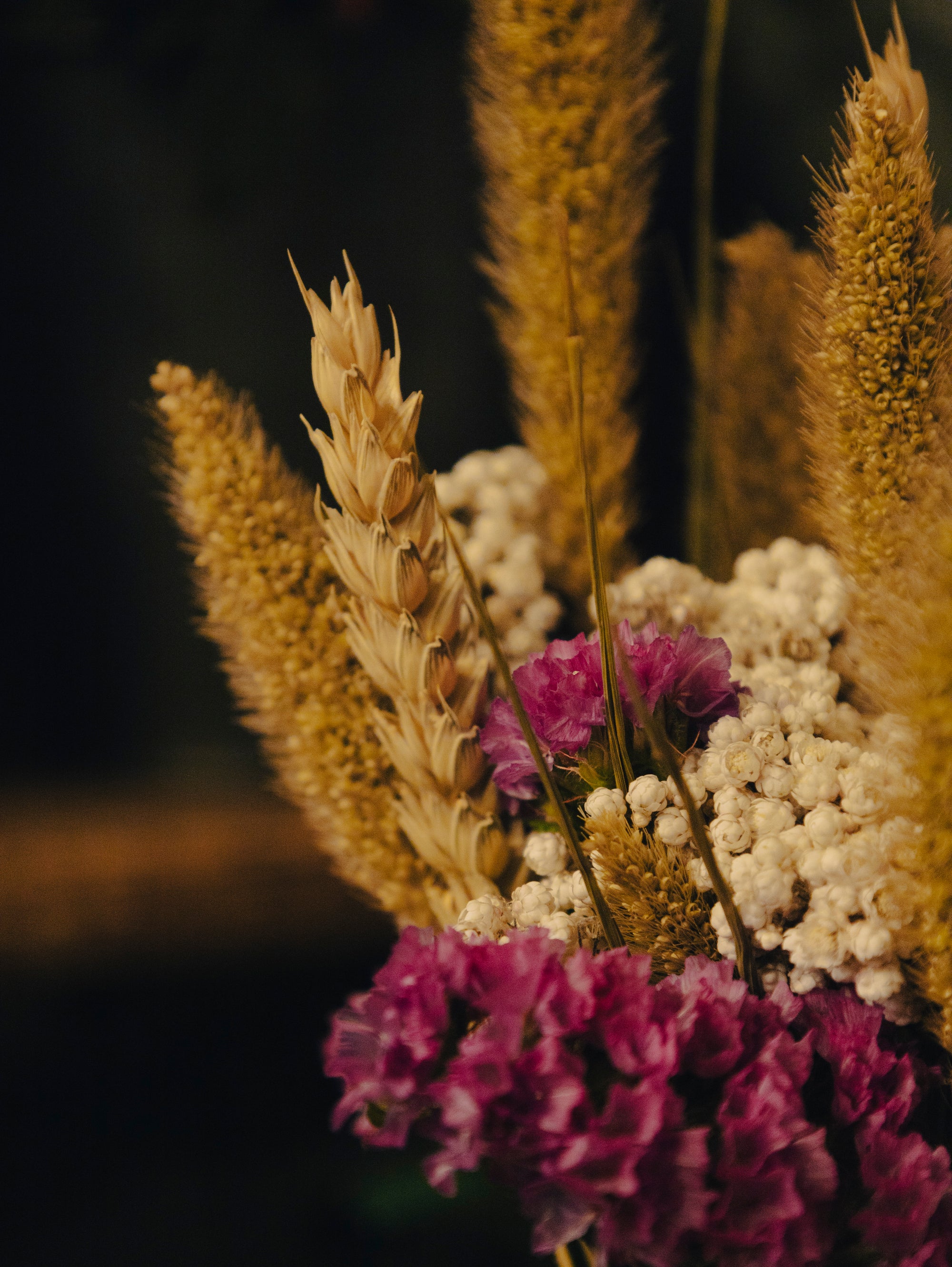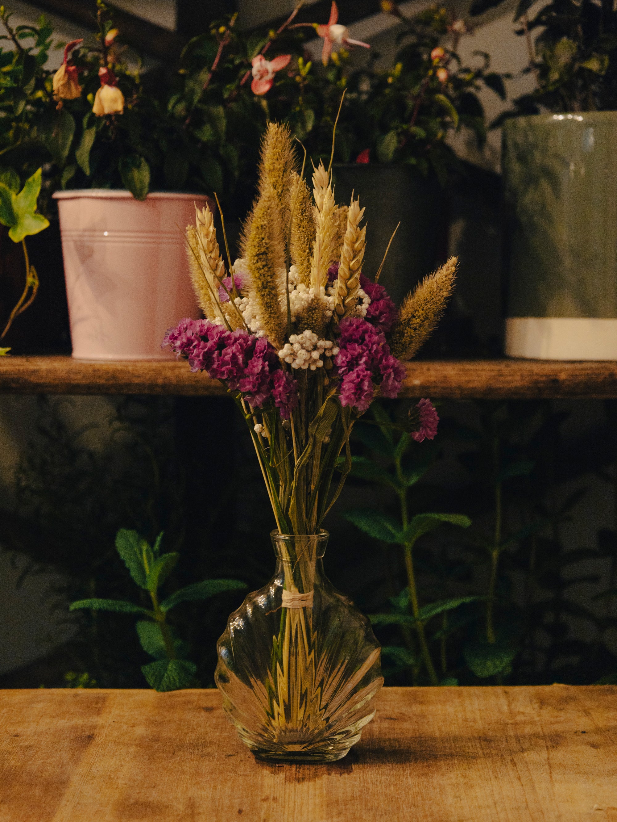 - Fleurs violettes séchées : Ces touches de couleur offrent un contraste vibrant et ajoutent une touche de sophistication et de fraîcheur.