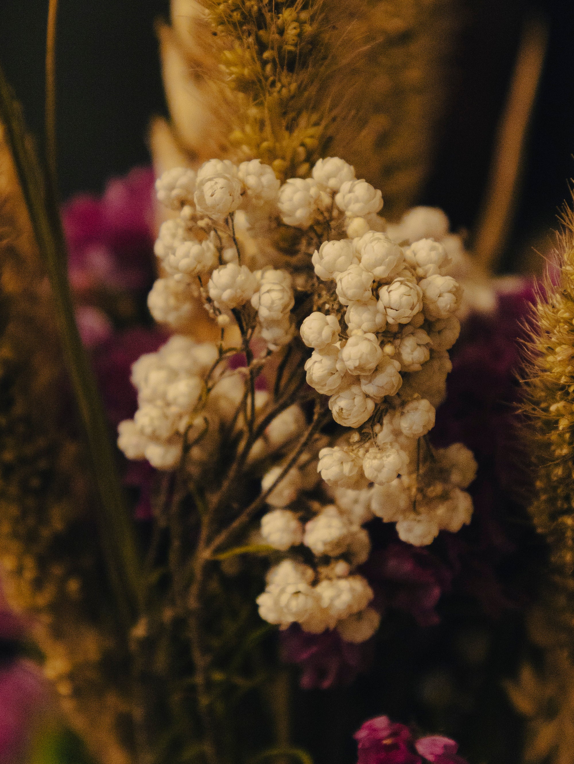 - Fleurs blanches séchées : Petites et délicates, elles équilibrent le bouquet en y apportant de la légèreté et une douceur subtile.