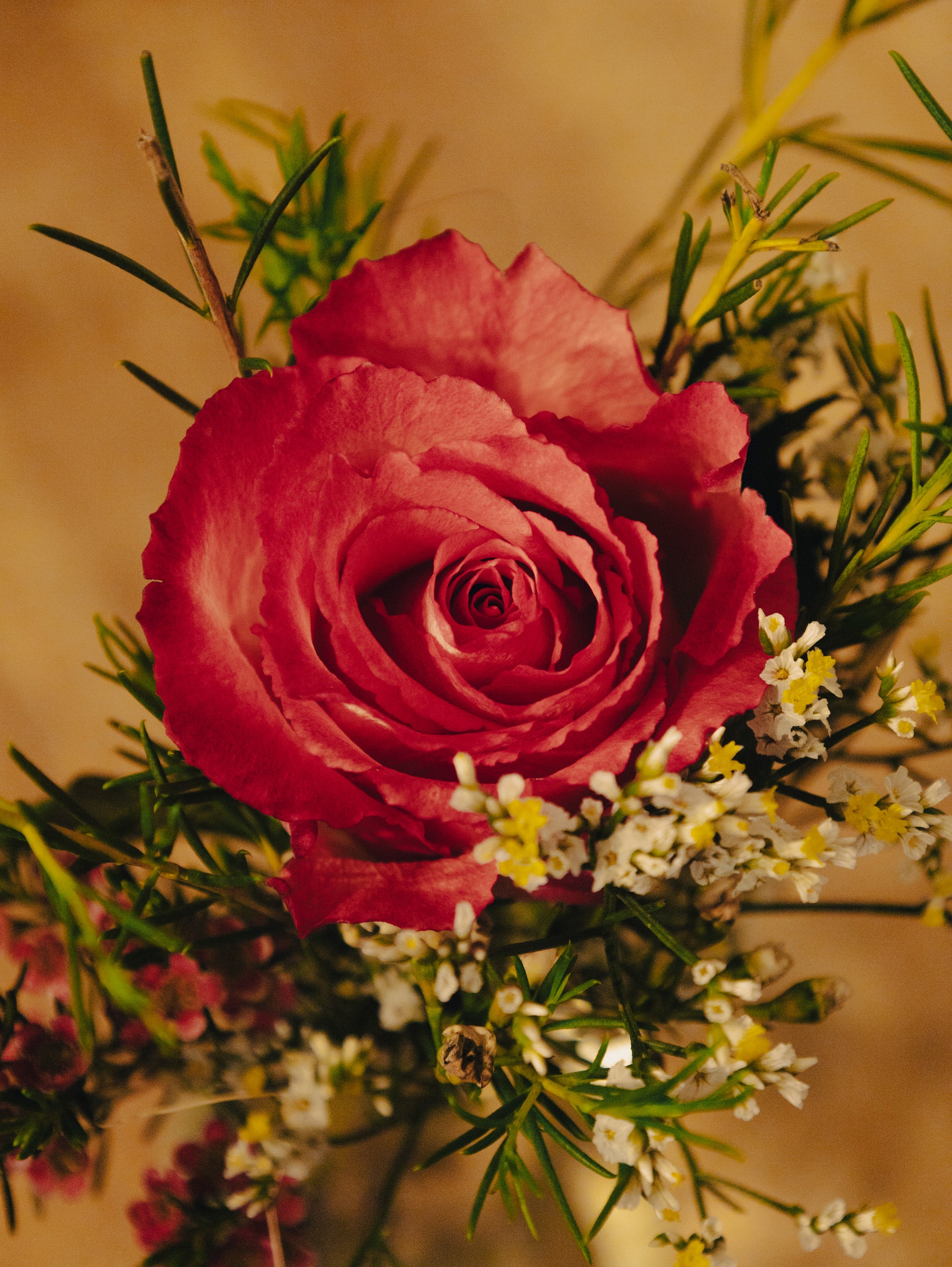 - Petites fleurs blanches : Légères et discrètes, elles ajoutent une touche aérienne et délicate autour de la rose, créant un bel équilibre.