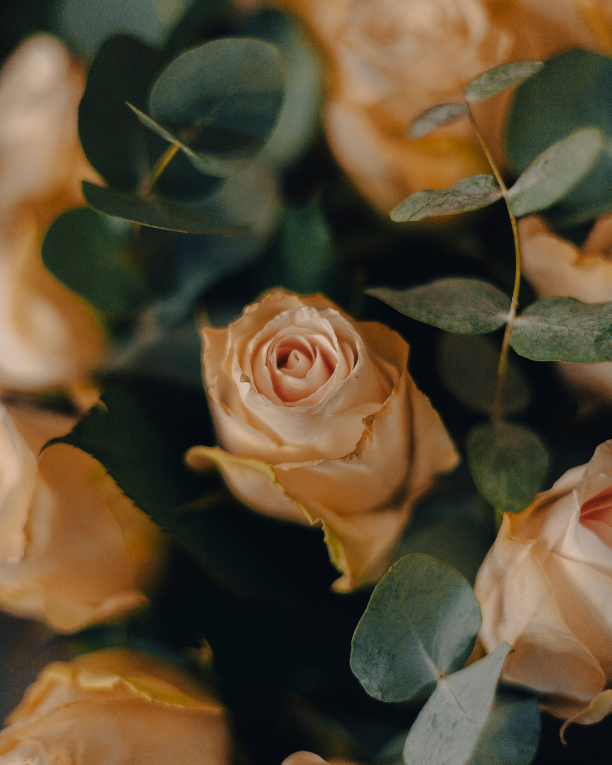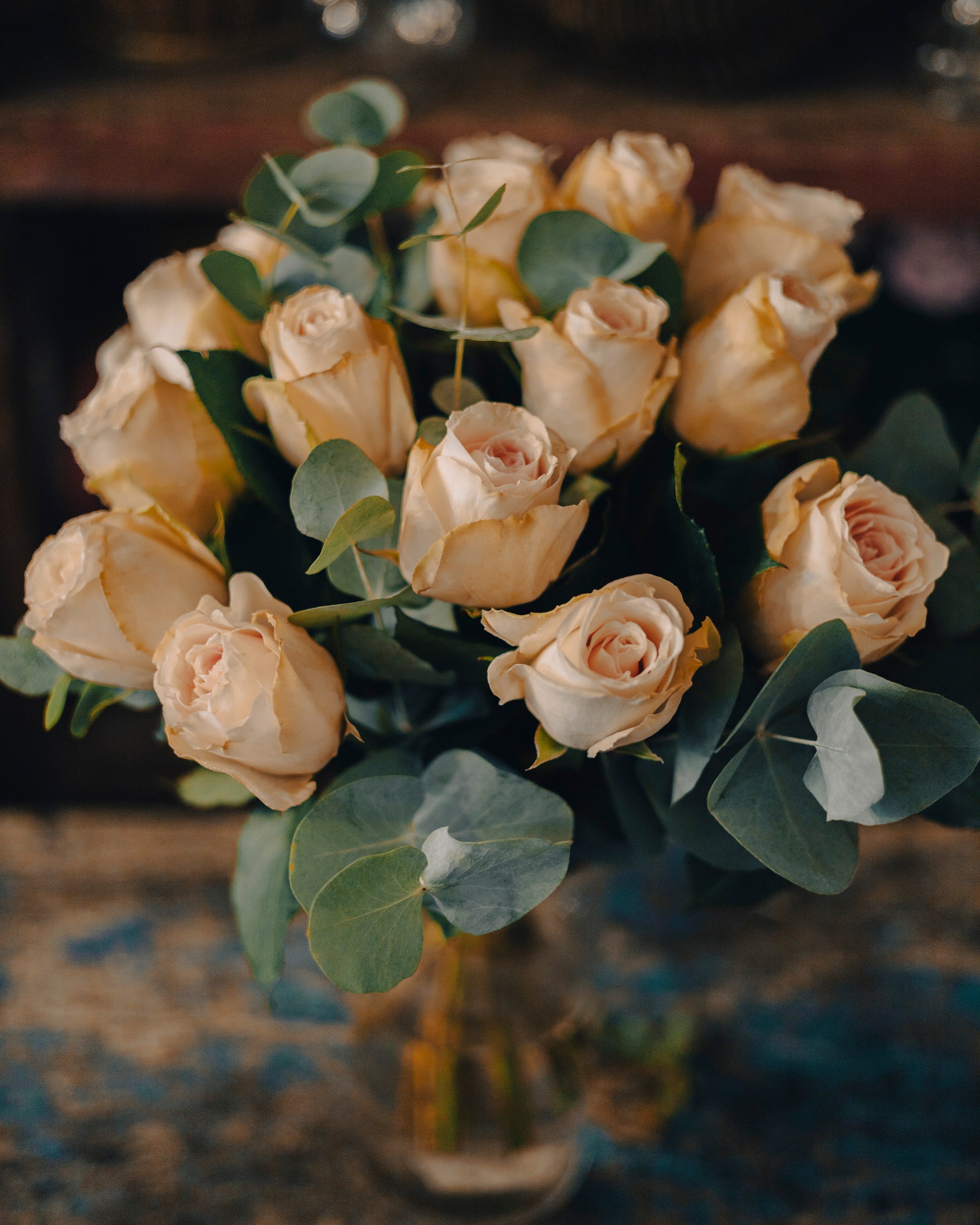 Depuis l'antiquité, les fleurs sont des symboles de communication émotionnelle. Elles embellissent les moments les plus précieux et représentent la pureté et la beauté dans les cultures du monde entier. Ce bouquet, avec ses roses crème et son feuillage d'eucalyptus, capture parfaitement cette tradition intemporelle de beauté et d'expression des émotions.