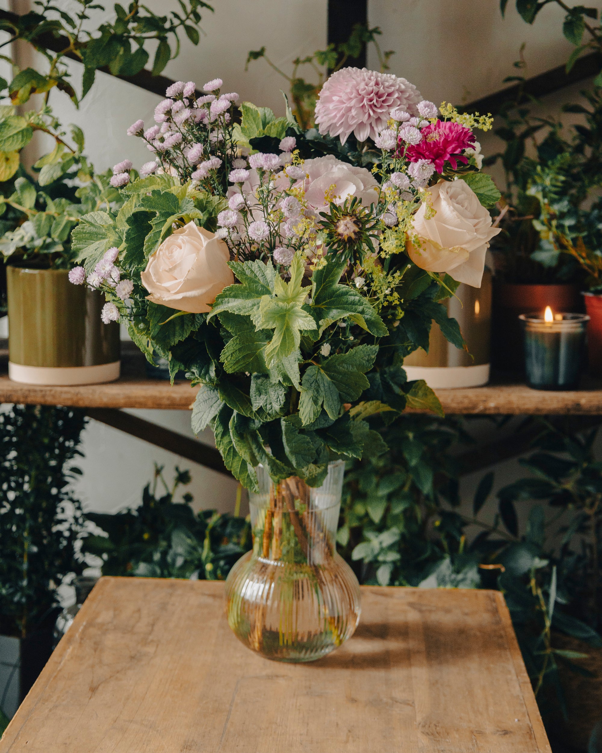 Les roses crème, les fleurs les plus dominantes de ce bouquet, sont originaires de diverses régions du monde, principalement d'Asie, et sont cultivées depuis des millénaires pour leur beauté et leur fragrance. Les chrysanthèmes mauves, quant à eux, sont originaires d'Asie, principalement de Chine, et sont appréciés pour leur longue durée de vie et leur capacité à fleurir tard dans l'année.